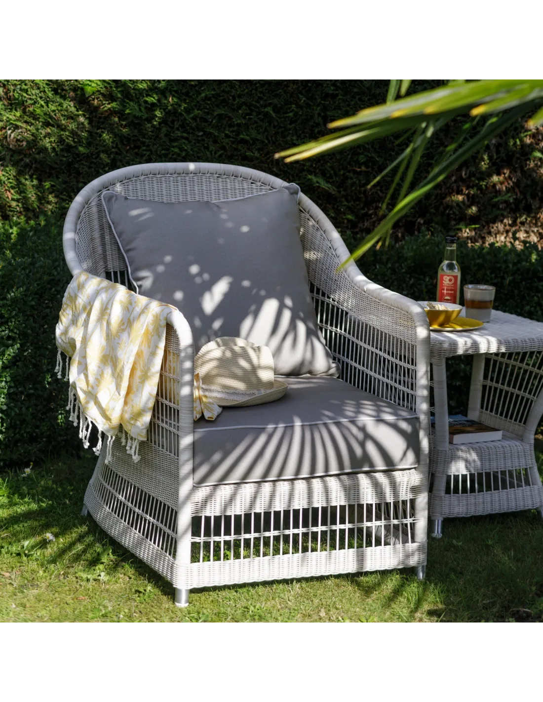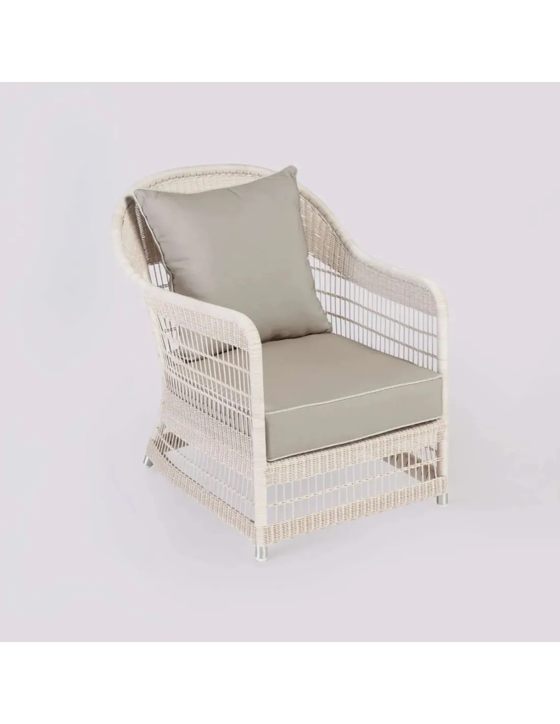 The Biarritz outdoor rattan garden chair is based on the furniture designs found on the terraces of colonial houses. The resin used is incredibly similar to a cream rattan, hence its name: ""synthetic rattan"". This results in a very lightweight, visually very airy and weather-resistant seat.
