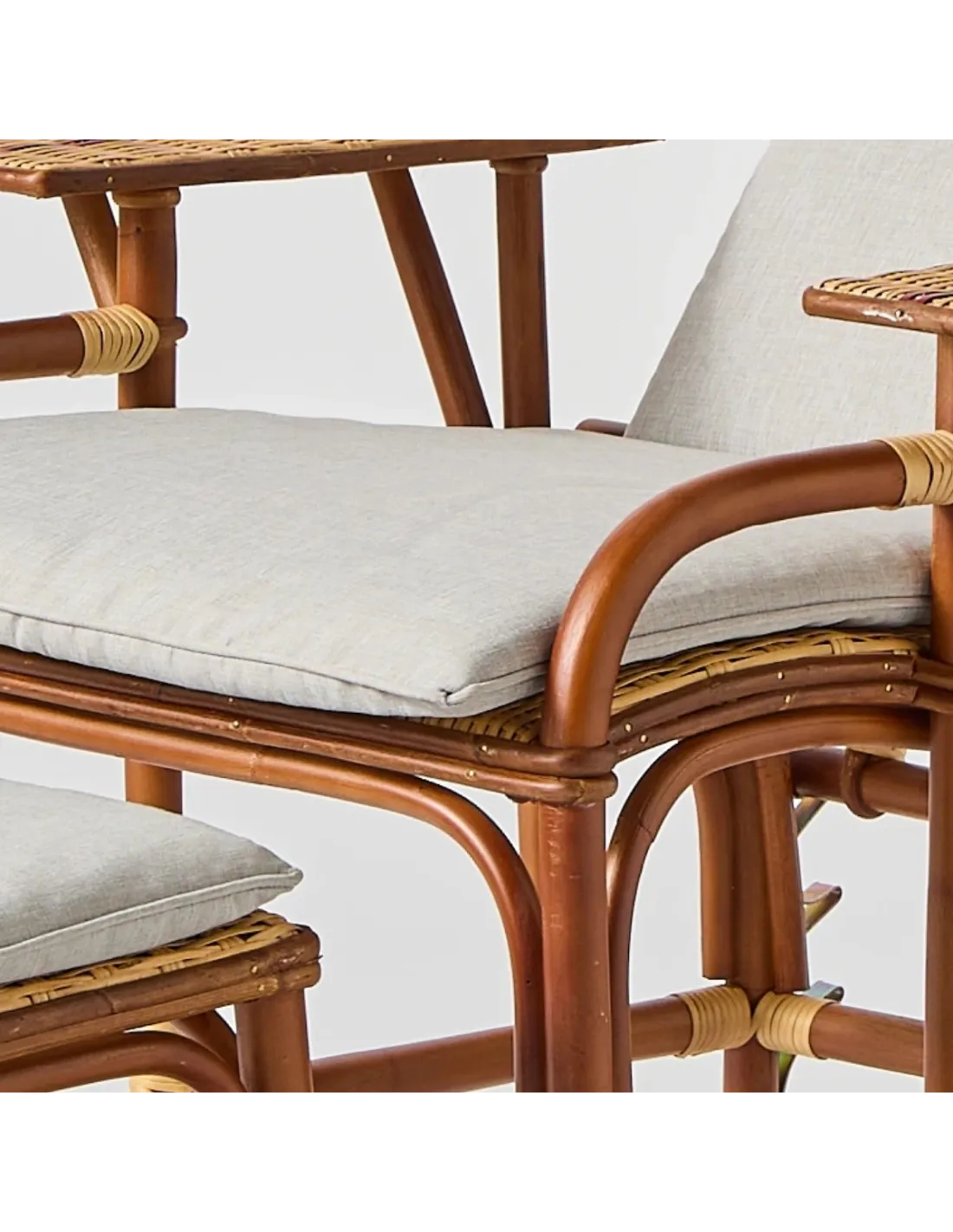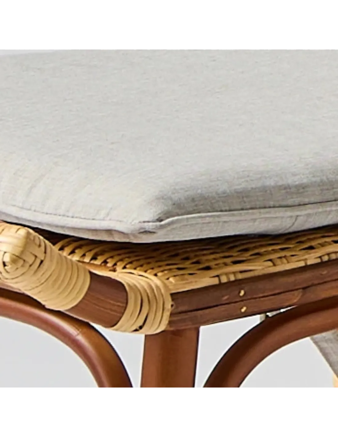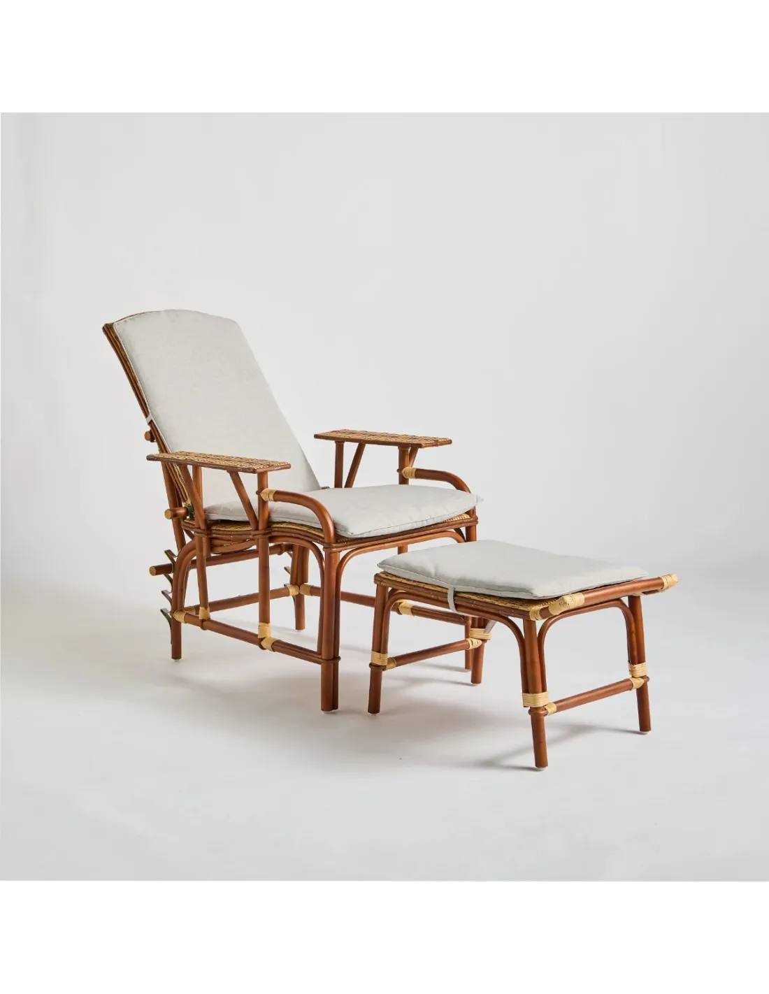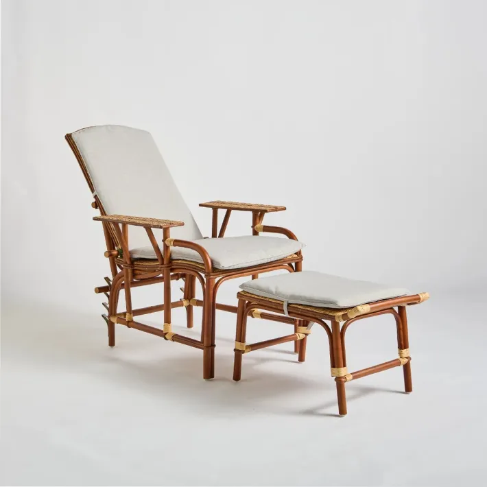 This complete cushion fits on the "Bagatelle" rattan lounger from KOK Maison. It is composed of a seat and backrest connected by a piece of fabric that follows the inclination of the lounger, and a cushion for the footrest. The lounger is already quite comfortable so the cushion is only optional. However, it will add softness and comfort, much appreciated for a long afternoon nap.