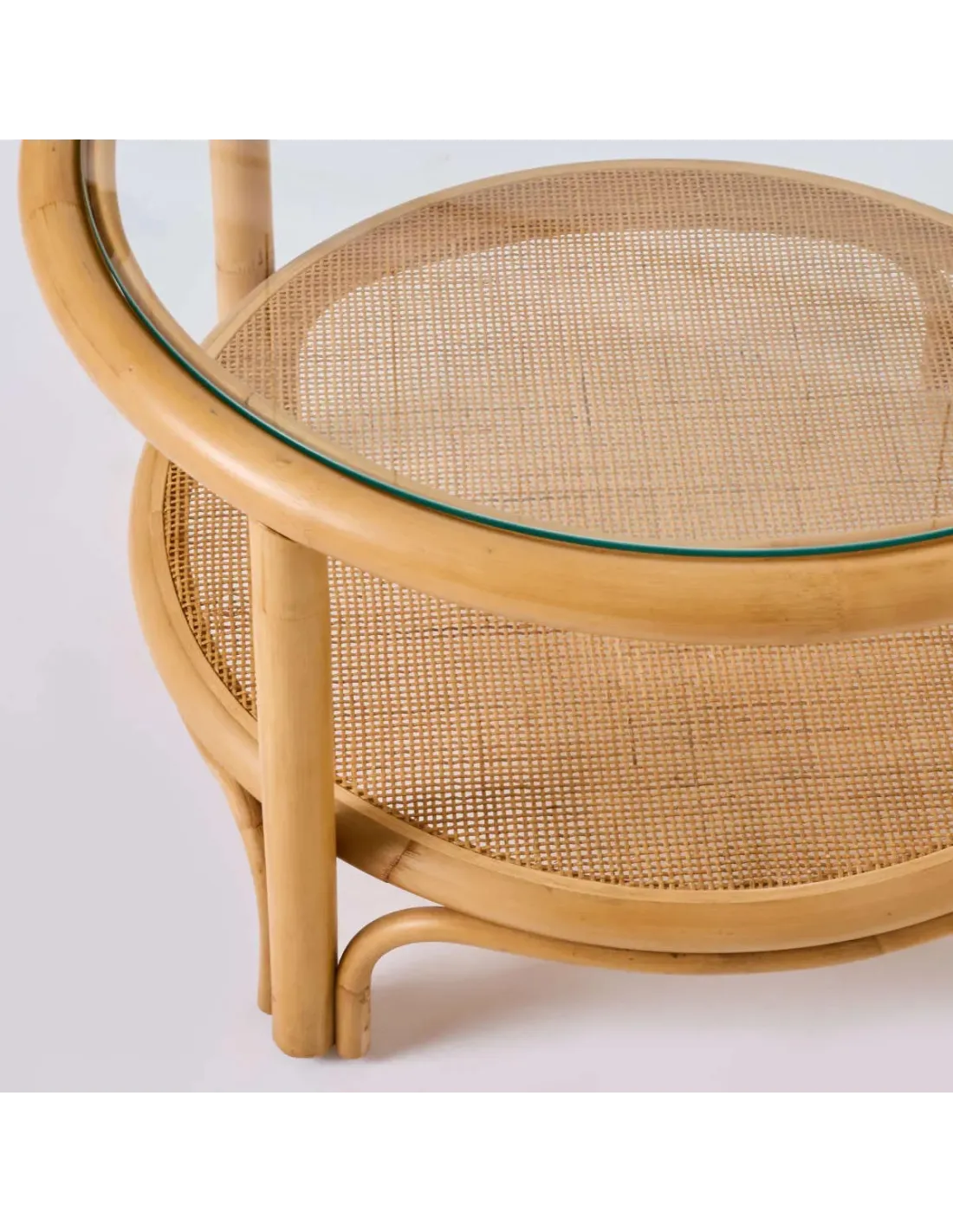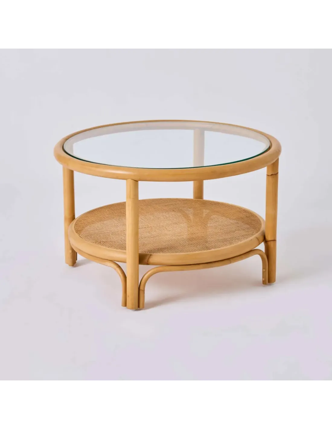 Overall dimensions: height 42 x diameter : 66cm. Weight 5 kg with glass. Structure in semi-polished natural rattan, with color and varnish. Delivered with a 5 mm thick glass top. Indonesian manufacture.