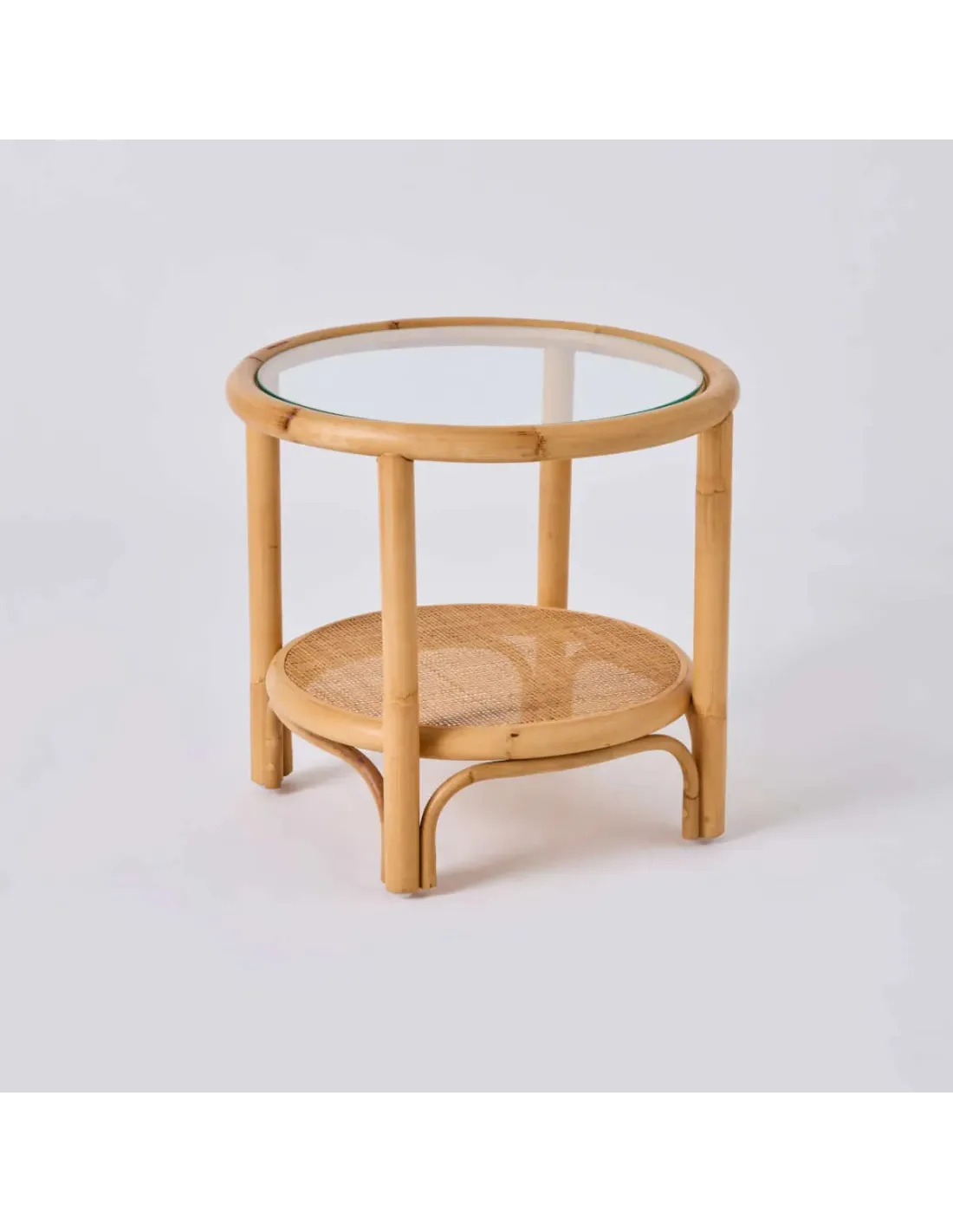 Overall dimensions: height 47 x diameter : 50 cm. Weight 3 kg with glass. Structure in semi-polished natural rattan, with color and varnish. Delivered with a 5 mm thick glass top. Indonesian manufacture.
