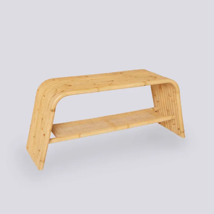 Inspired by the lines of the 70s and 80s, the Riviera collection in natural rattan plays with its characteristics: big diameter of rattan cane, simple lines, rattan weaving. Except the vibrant colors that were used in these days. We preferred a natural finish, that brings a very contemporary style : rattan is semi-polished, the nods are still partially visible, and we add a light amber color to homogenize the fiber, and a transparent varnish. This elegant and timeless bench will be perfect in a winter garden or conservatory as well as around modern furniture where it will bring a warm and soft touch.