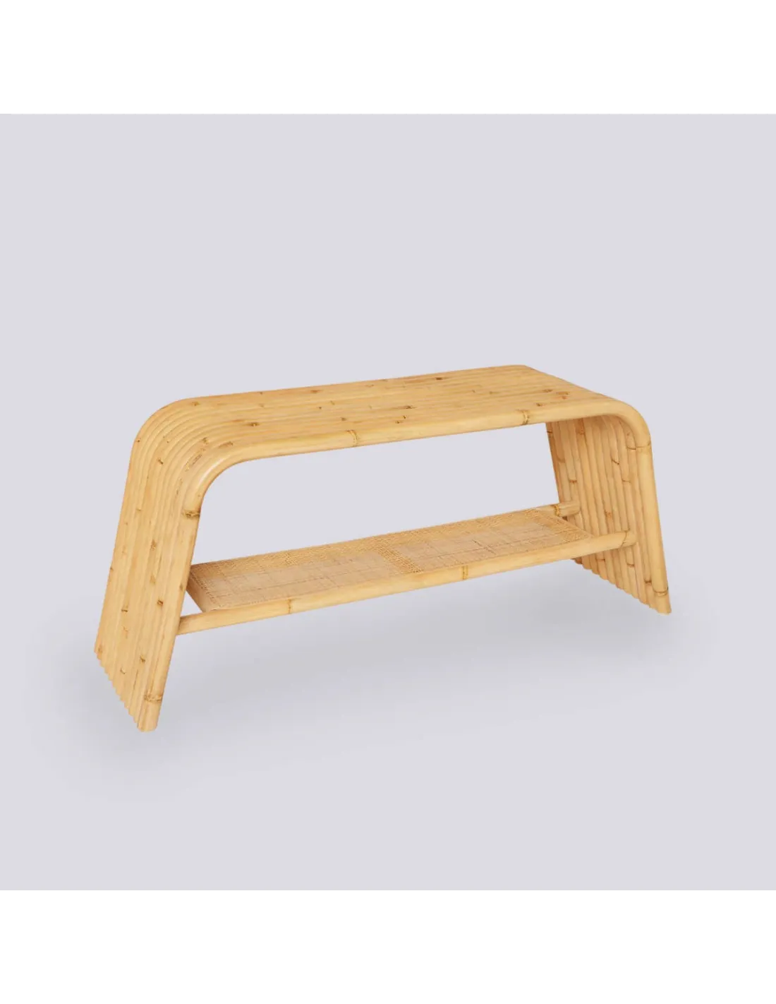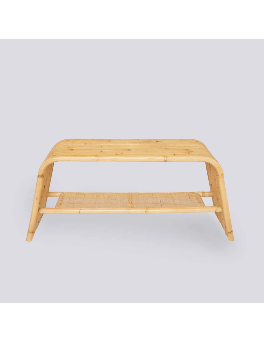 Overall dimensions: height 45 x width : 95 cm x depth : 35 cm. Weight 6 kg. Structure in semi-polished natural rattan, with color and varnish. Delivered assembled. Indonesian manufacture.
