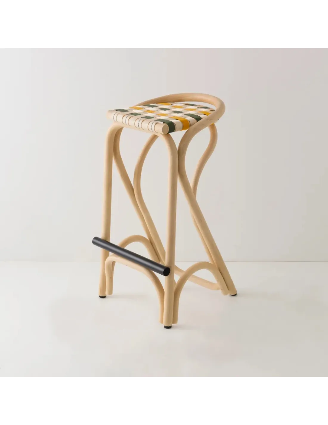 "The bar stool seemed an important element to add to the collection because it is an essential piece of furniture for convivial spaces; lounge bar or open kitchen. Long curved canes evoke the "Nouille" style. The coloured straps bring a cheerful modernity. The à la carte weaving makes it unique." Tina Ledi