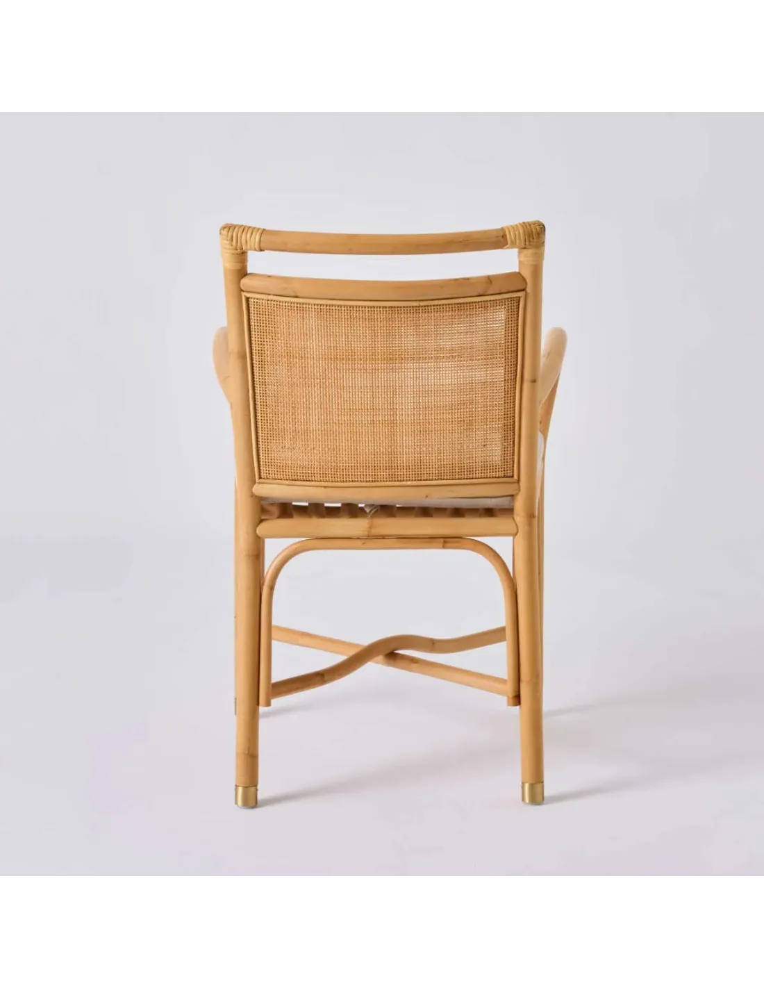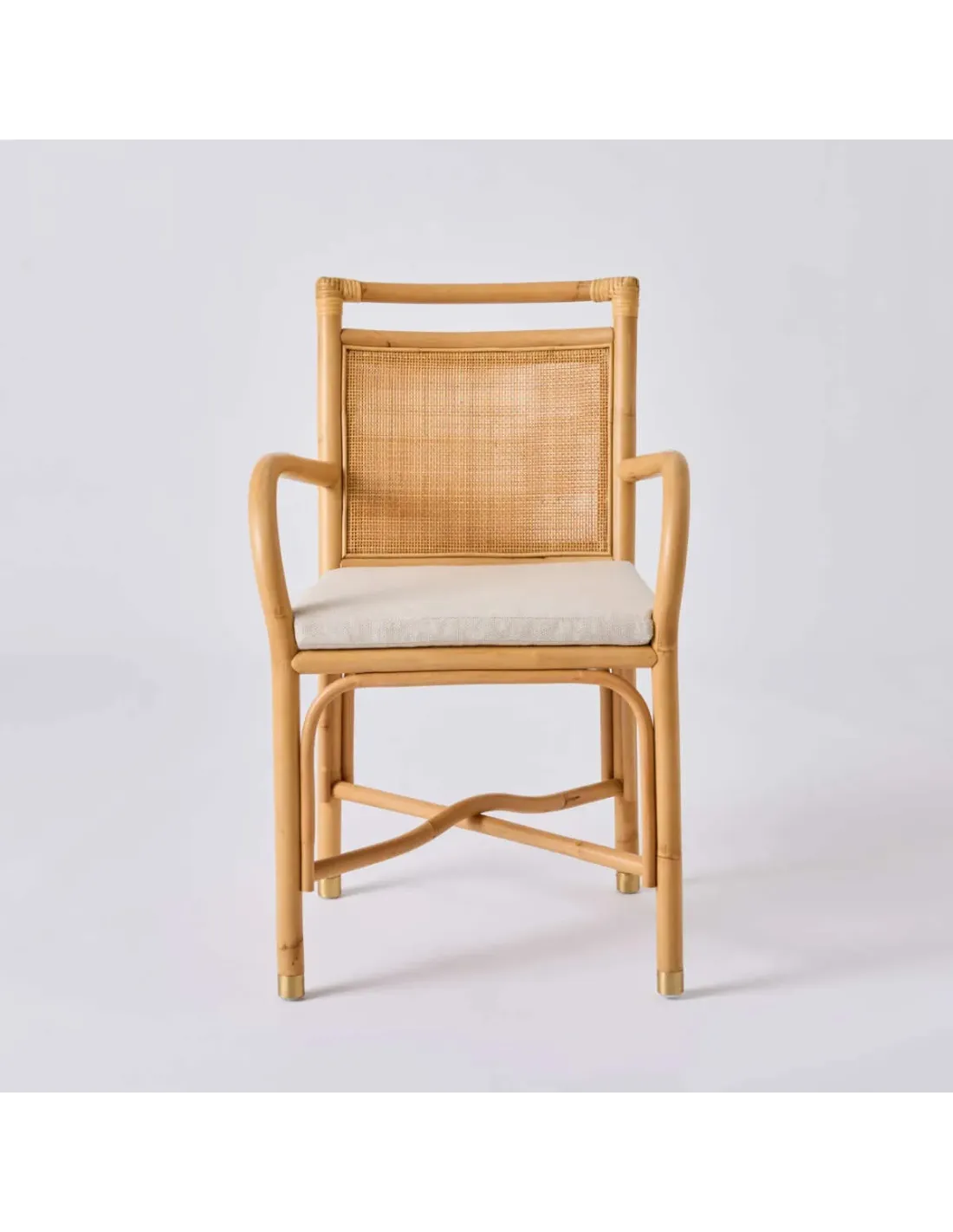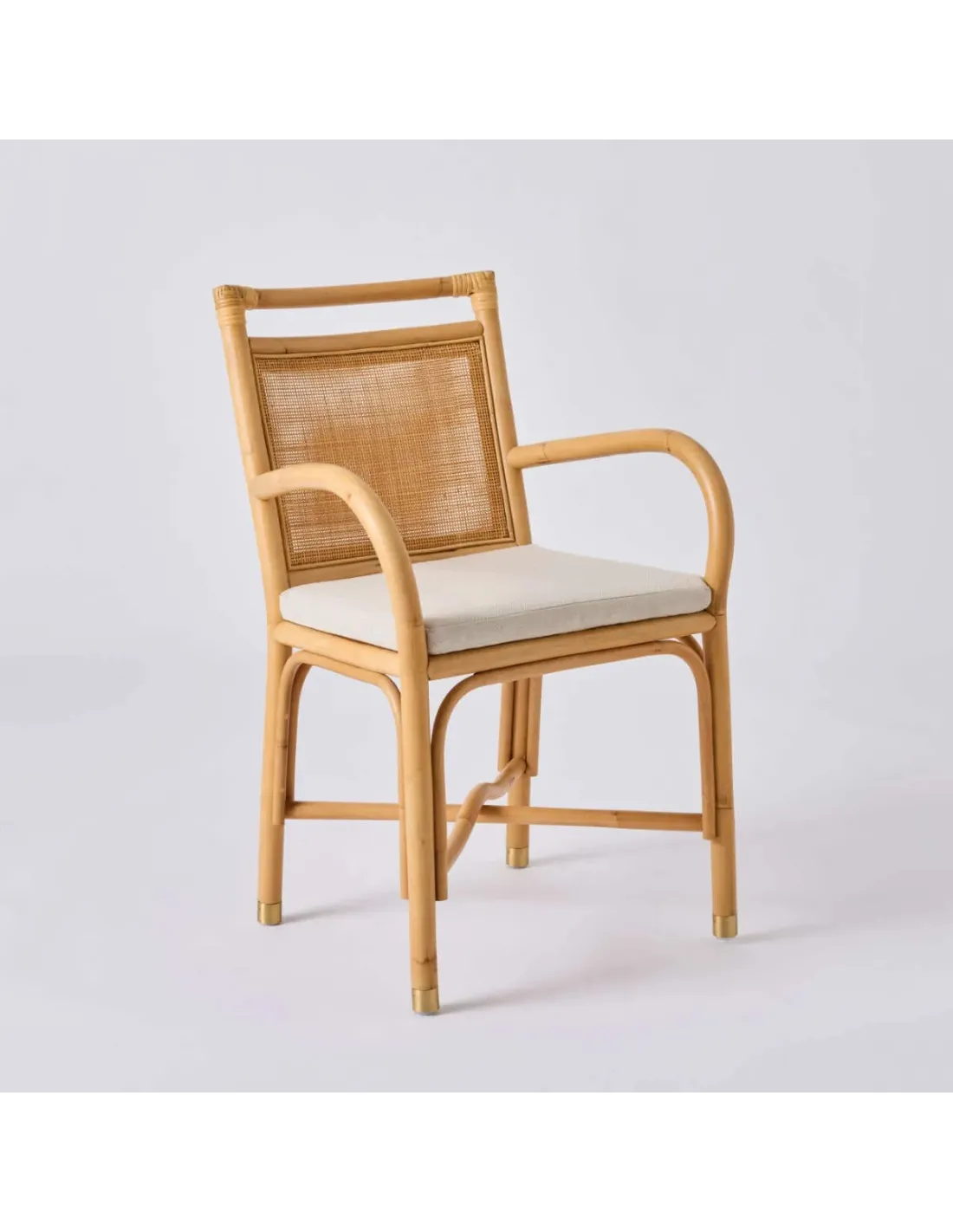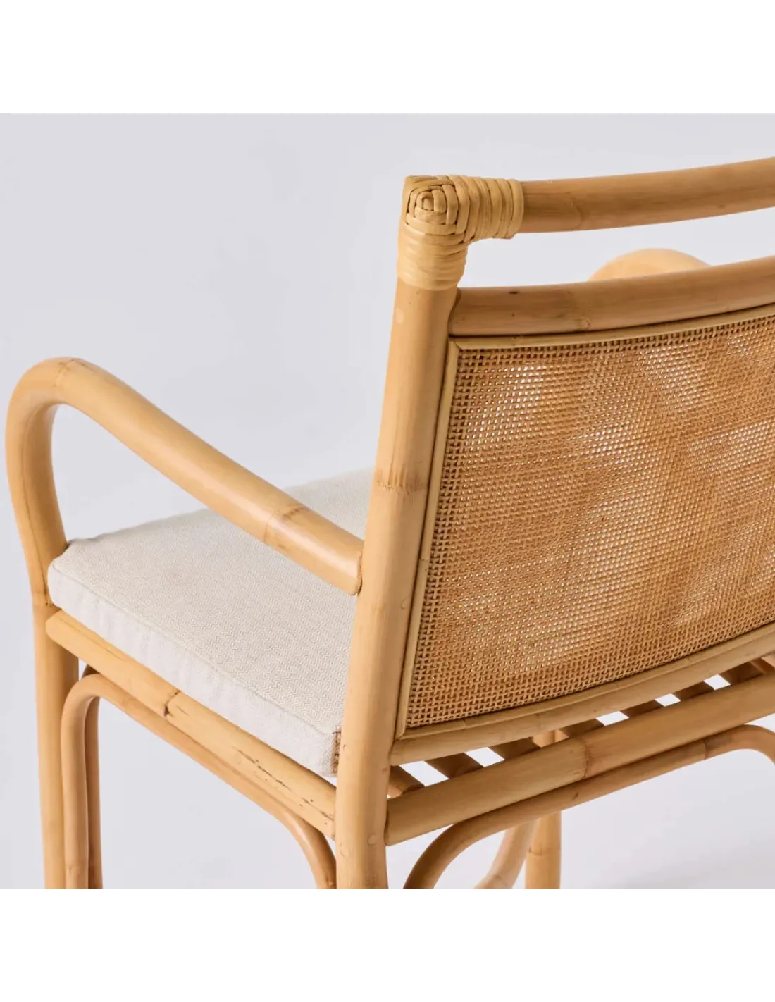 Inspired by the lines of rattan from the 70s and 80s, the Riviera rattan table armchair takes up its characteristic graphic codes: rattan with a generous diameter, simple shapes, compact dimensions, top-of-the-range finishes: removable cushions, linen/cotton fabric, double caning on the backrests, brass cabochons...