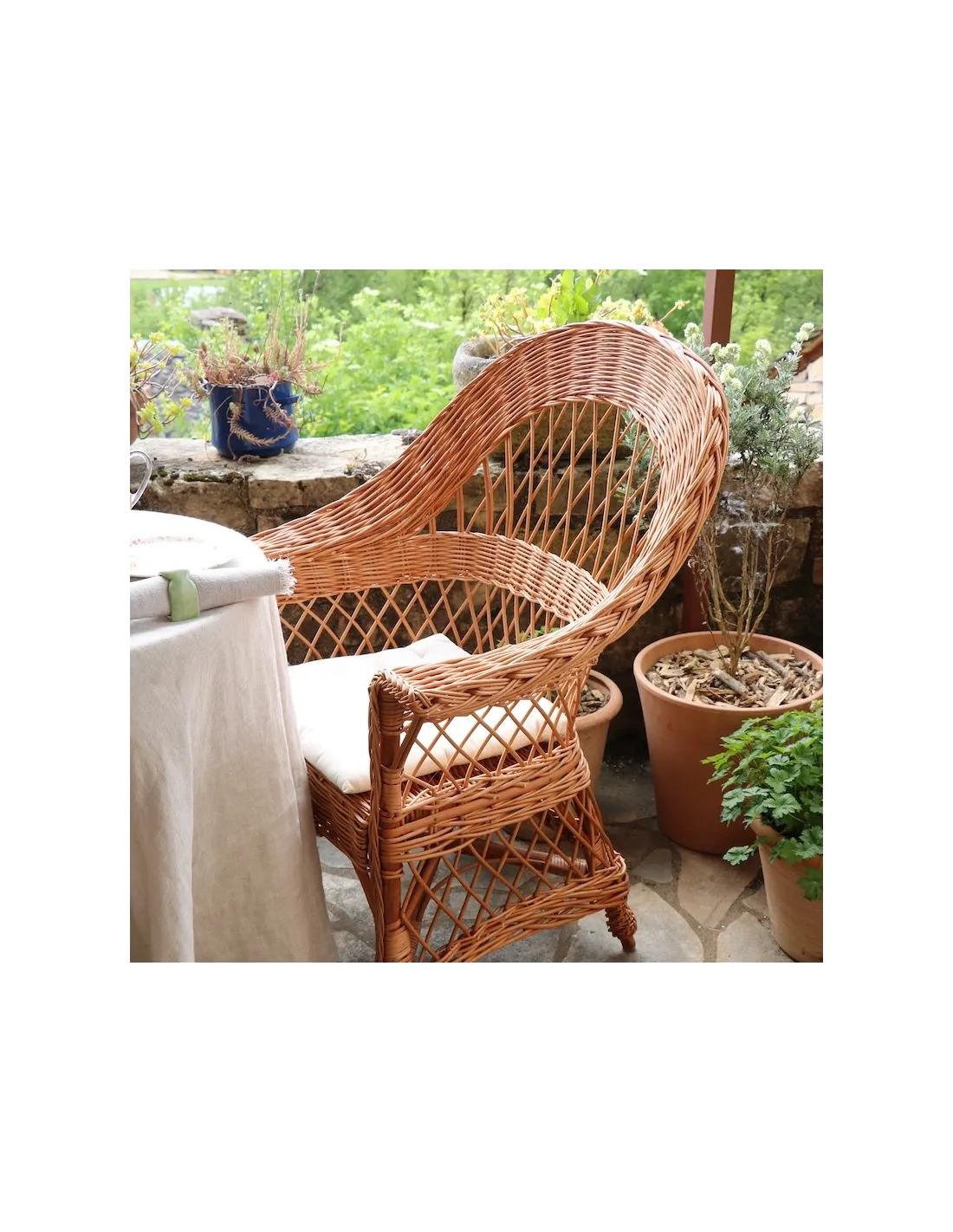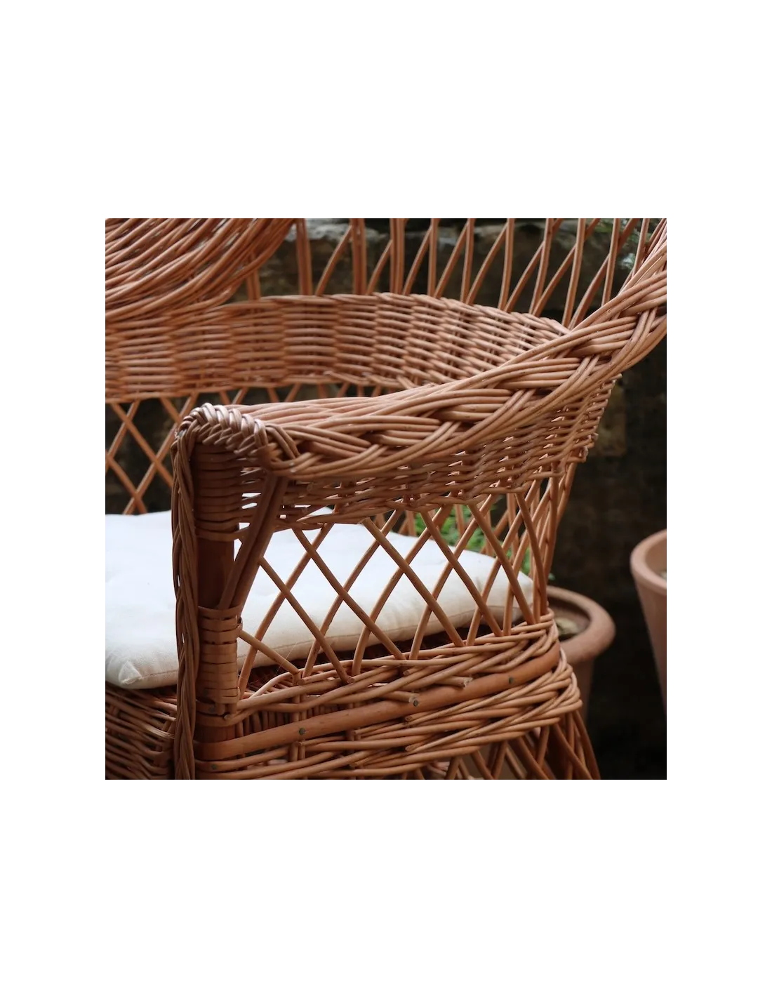If the natural place to place a wicker armchair is a conservatory, a winter garden or a country house, it is not advisable to use it as garden furniture. Wicker is willow, a wood like any other that is not made to withstand prolonged exposure to the elements, damp, frost or direct sunlight. You can, however, take it outside occasionally in fine weather.