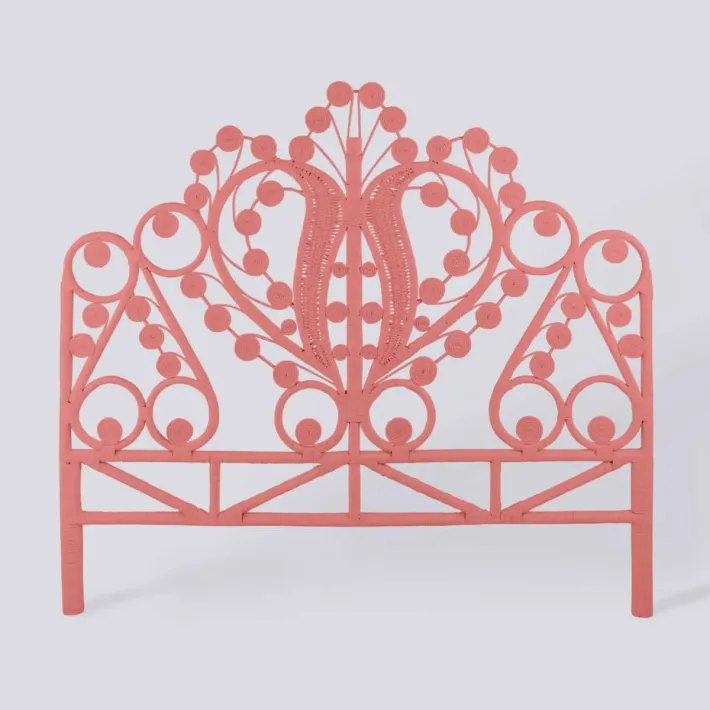 Our Maharaja rattan headboard features a finely crafted motif of rattan core and rattan skin woven into delicate scrolls and ligatures. The steam-bent rattan fiber is used to make the many spirals that adorn the Maharaja rattan headboard. Airy and oriental in inspiration, the Maharaja rattan headboard is reminiscent of the spirit of the Emmanuelle rattan armchairs.
