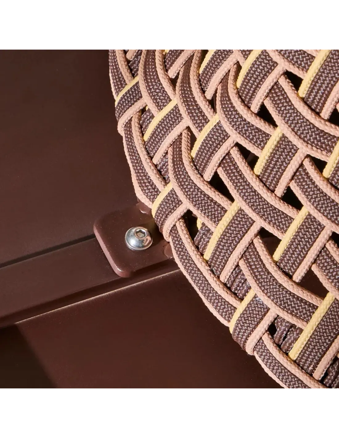 The refinement and balance of the whole is further enhanced by the choice of a precious and original weave: an original pattern of thick chocolate-coloured webbing edged with powder pink and straw yellow cords creates a visually rich rhythm.