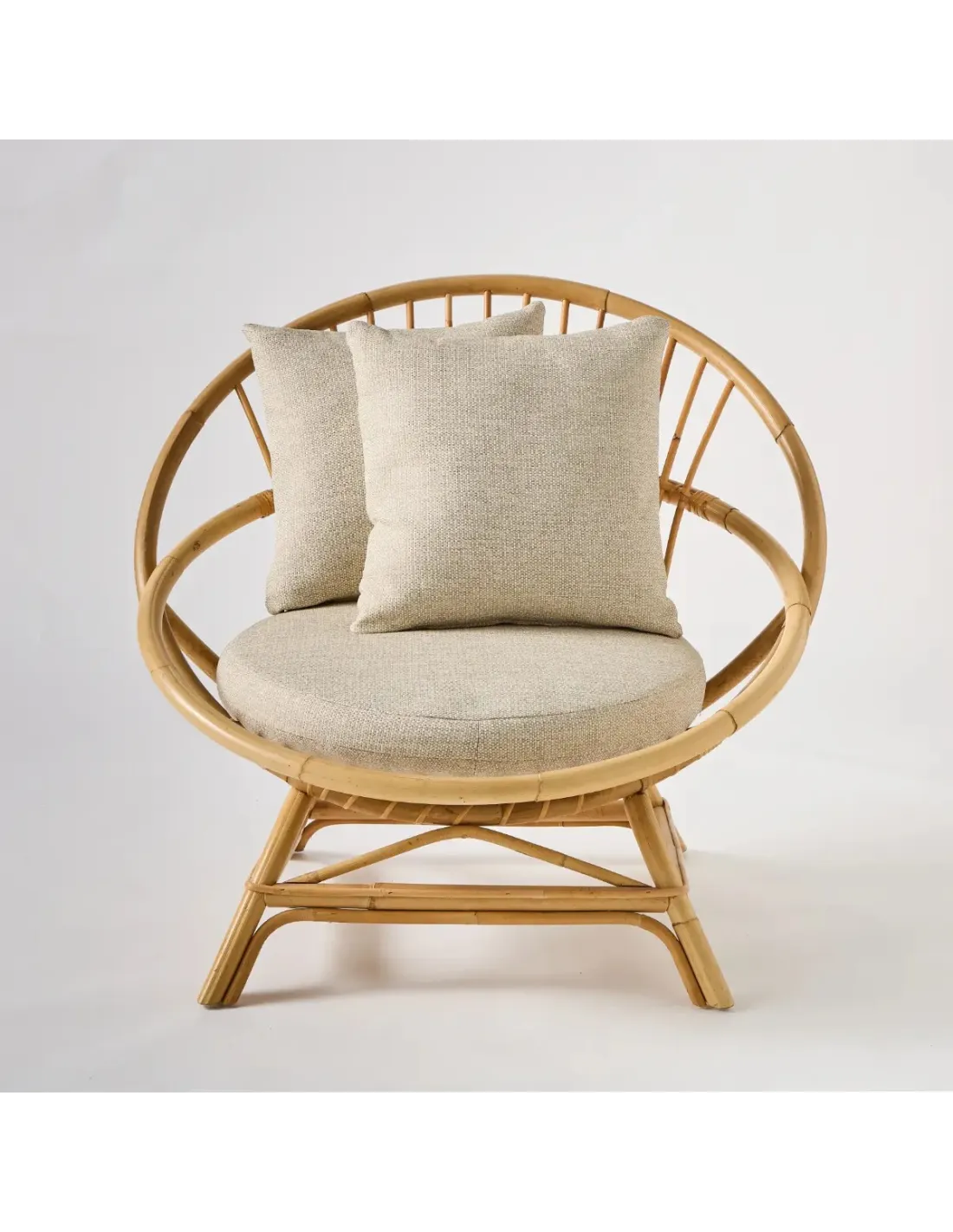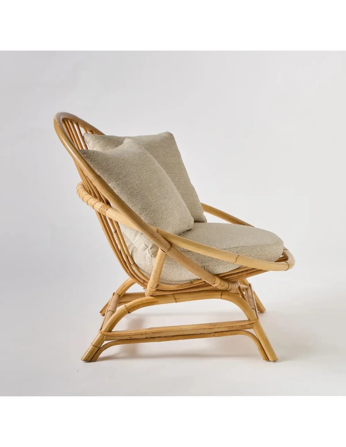 Overall dimensions: height 88 x width 100 x depth 92 cm, seat height 43 cm, with cushion. Delivered assembled, not stackable. Weight 10 kg with cushion. Structure in natural, semi-peeled rattan, cellulose matte varnish. 4 small nylon glides under each leg. Seat cushion filled with polyurethane foam 30 kg/m3 density, back cushions filled with polyester wadding. All cushions are removable and covered with 100% polypropylene (olefin) fabric, guaranteed UV-resistant, mildew-resistant and washable. Made in Indonesia.