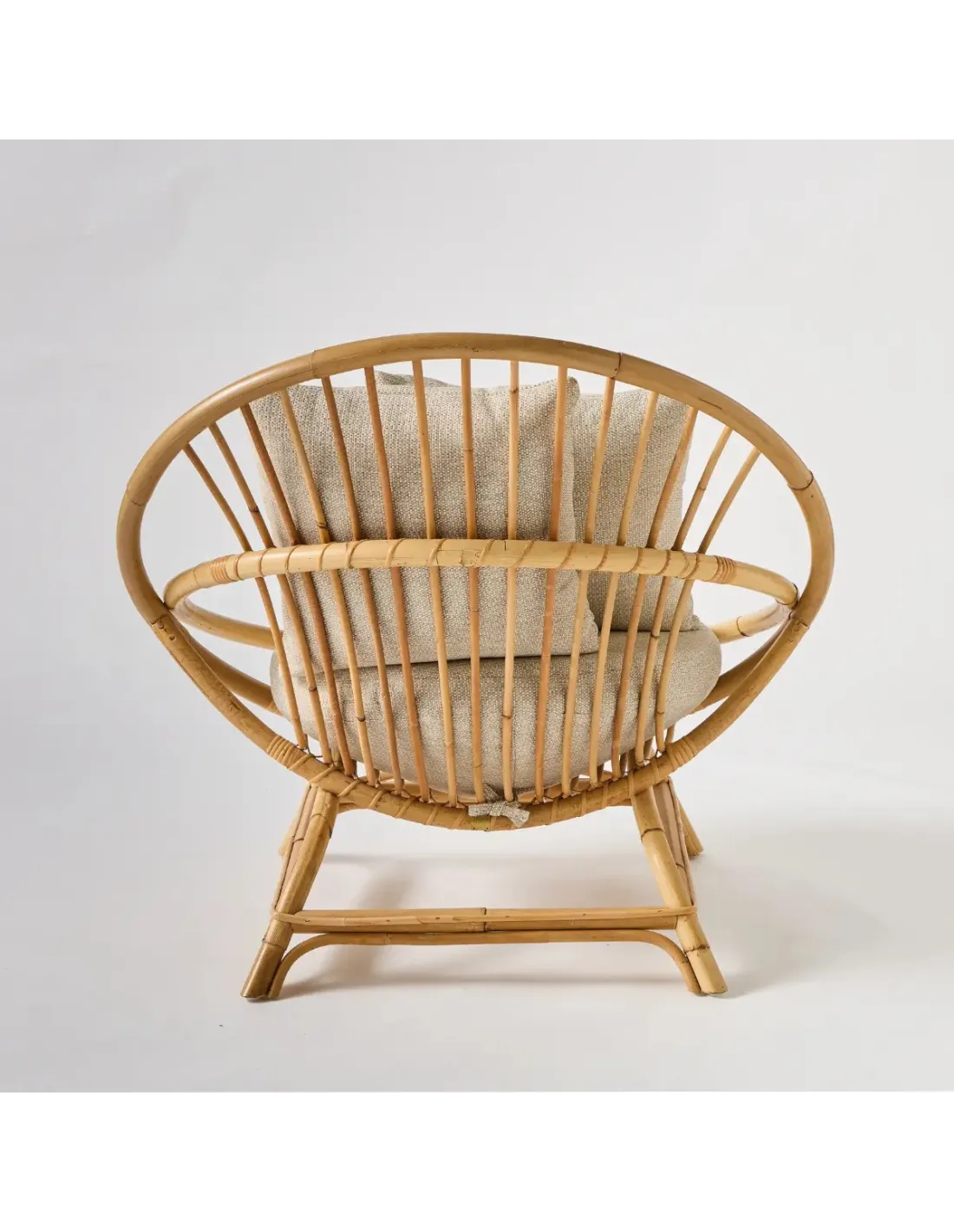 It's a unique blend that KOK offers you here. A construction typical of the “coquille” rattan armchairs of the 60s, with its two interlocking circles, but equipped with a contemporary foam cushion, removable and covered with an “outdoor” fabric. Visually, the Miami maxi armchair is strangely reminiscent of the rattan love seats from Thailand that were all the rage in the 70s. Low-quality (poor-quality rattan dyed dark brown, with a Kapok cushion covered in unbleached cotton) but inexpensive, these loveuses, also known as “papasan”, were to take the old continent by storm and usher in a new approach to rattan: exotic, cheap and casual. This was, it has to be said, the beginning of the end for European rattan furniture manufacturers, who could no longer compete with low labor costs, nor could they persist in transforming a raw material that was legitimately better off in the countries where rattan grew. KOK decided to follow the trend, but refused to cut corners in terms of quality. Over 40 years' work has enabled our former suppliers of raw materials, mainly in Indonesia, to gradually become manufacturers of top-of-the-range rattan furniture. Two generations later, we are still buying from them. The Miami rattan maxi armchair you see here is the fruit of this history: an aesthetic inspired by the legend of rattan, with no concessions in terms of the quality of the materials used, or the workmanship.