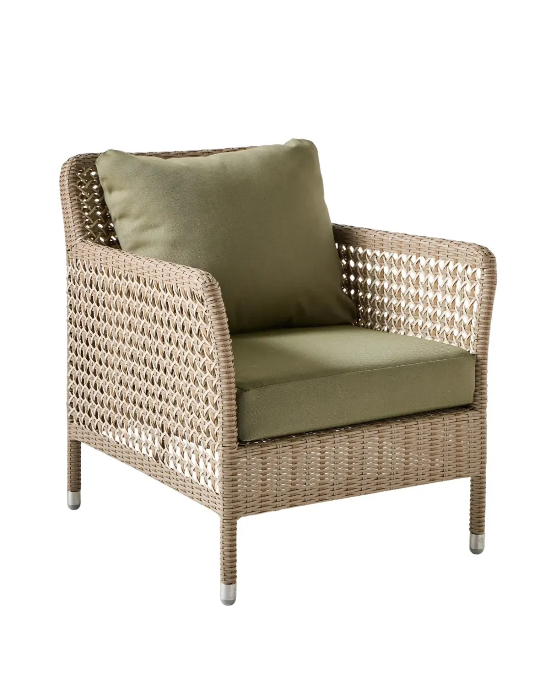 Overall dimensions: height 75 x width 66 x depth 75 cm, seat at 41 cm (with cushion). Weight 9 kg with cushions. Powder-coated aluminum frame, HDPE resin weave. Made in Indonesia. Seat cushion in 30 kg density polyurethane foam, back cushion in polyester wadding. Both cushions are removable. All fabrics are UV- and mildew-resistant for outdoor use. Perle gray fabric, 100% olefin. Plain and striped fabrics, 100% acrylic. Bouquet fabrics, 100% dralon. The cushion in pearl gray fabric is made in Indonesia (base price). Trimmings in other fabrics are made in France on request, subject to a lead time of approx. 3 weeks and a surcharge.