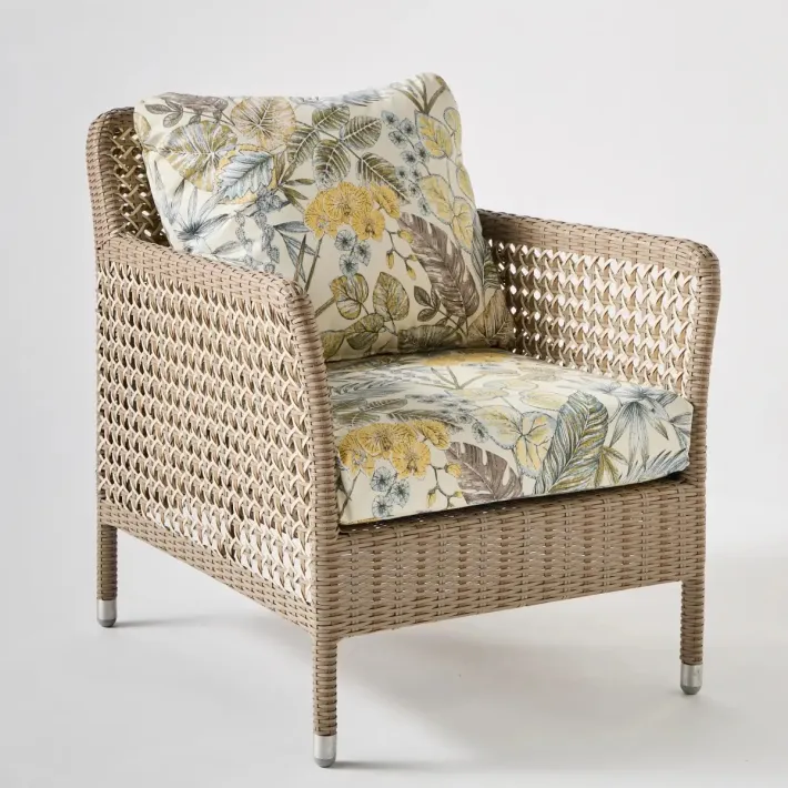 Overall dimensions: height 75 x width 66 x depth 75 cm, seat at 41 cm (with cushion). Weight 9 kg with cushions. Powder-coated aluminum frame, HDPE resin weave. Made in Indonesia. Seat cushion in 30 kg density polyurethane foam, back cushion in polyester wadding. Both cushions are removable. All fabrics are UV- and mildew-resistant for outdoor use. Perle gray fabric, 100% olefin. Plain and striped fabrics, 100% acrylic. Bouquet fabrics, 100% dralon. The cushion in pearl gray fabric is made in Indonesia (base price). Trimmings in other fabrics are made in France on request, subject to a lead time of approx. 3 weeks and a surcharge.