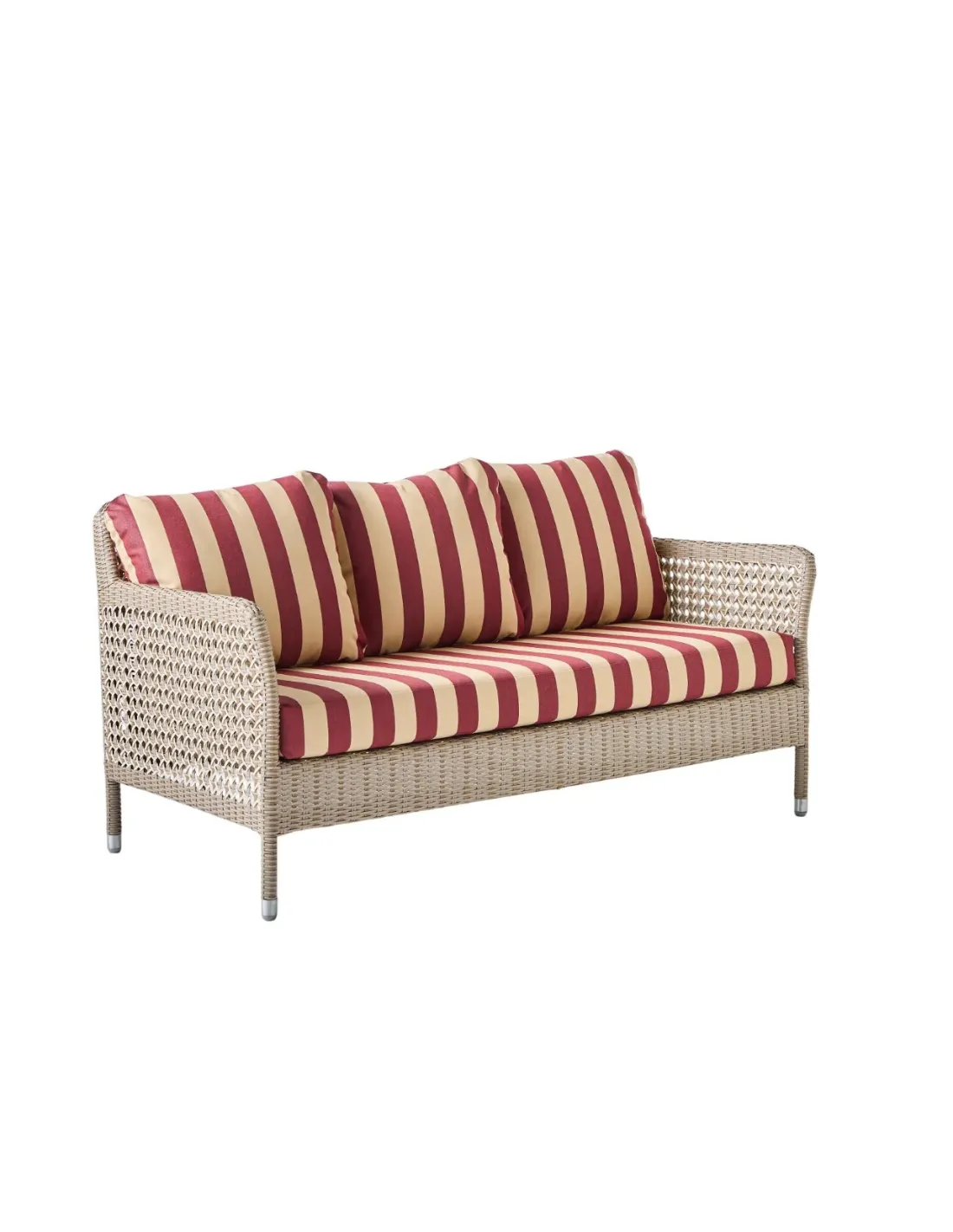 Overall dimensions: height 75 x width 147 x depth 75 cm, seat at 41 cm (with cushion). Weight 13 kg with cushions. Powder-coated aluminum frame, braided in PEHD resin. Made in Indonesia. Seat cushions in 30 kg density polyurethane foam, back cushions in polyester wadding. All cushions are removable. All fabrics are UV- and mildew-resistant for outdoor use. Perle gray fabric, 100% olefin. Plain and striped fabrics, 100% acrylic. Bouquet fabrics, 100% dralon. The cushion in perle gray fabric is made in Indonesia (base price). Trimmings in other fabrics are made in France on request, subject to a lead time of around 3 weeks and an additional charge.