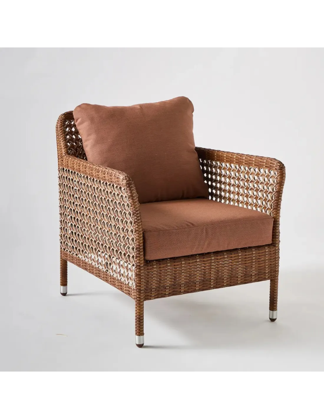 The laterite-colored Antibes resin armchair combines sober lines and refined “double-skin” weaving, in keeping with the spirit of KOK MAISON. We pay homage to the centuries-old tradition of rattan weaving, the famous “French-style” open cane, by adapting it to the spirit of the times: wide-opening “mesh” for a more contemporary look, the use of a robust, easy-care outdoor resin, and a precious harmony of 3 beige browns in a range of shades, the darker dominant reproducing the warm tone of tropical rocks and earth. The slim armrests and backrest reduce the chair's bulk without sacrificing comfort. This revisited classic will fit in anywhere, even in small spaces, by the sea, but also in the setting of a characterful stone residence, a relais-château, a city terrace or a mountain chalet....