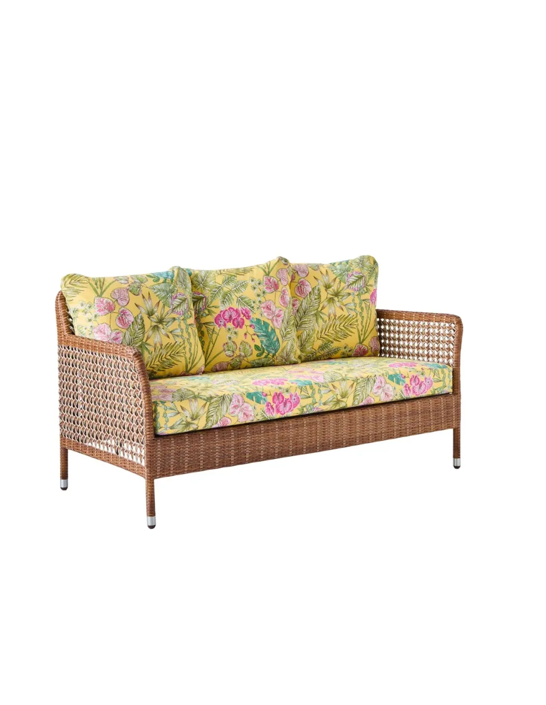 Overall dimensions: height 75 x width 147 x depth 75 cm, seat at 41 cm (with cushion). Weight 13 kg with cushions. Powder-coated aluminum frame, braided in PEHD resin. Made in Indonesia. Seat cushions in 30 kg density polyurethane foam, back cushions in polyester wadding. All cushions are removable. All fabrics are UV- and mildew-resistant for outdoor use. 100% olefin grey chenille fabric. Plain and striped fabrics, 100% acrylic. Bouquet fabrics, 100% dralon. The cushion in grey chenille fabric is made in Indonesia (base price). Trimmings in other fabrics are made in France on request, subject to a lead time of around 3 weeks and an additional charge.