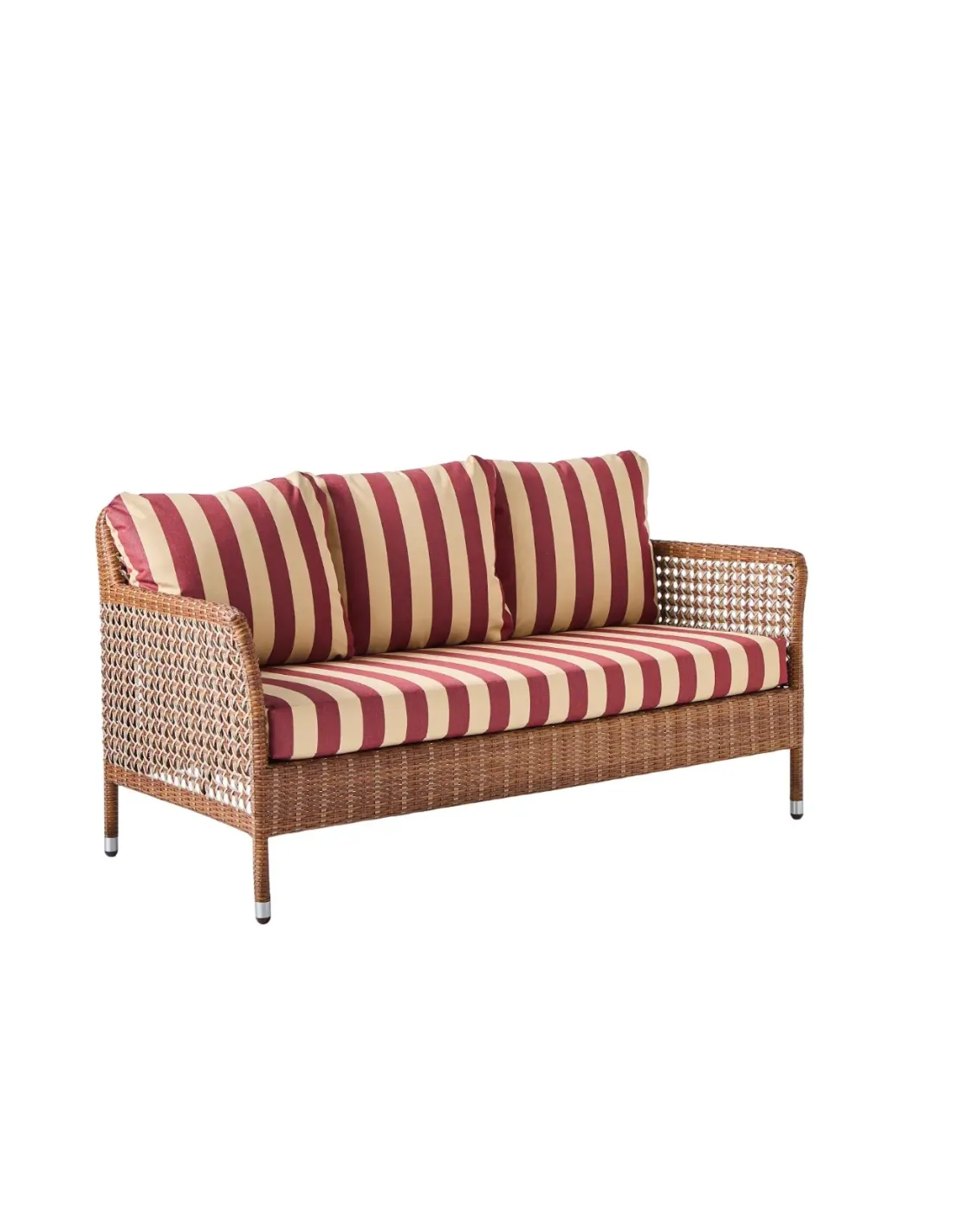 Overall dimensions: height 75 x width 147 x depth 75 cm, seat at 41 cm (with cushion). Weight 13 kg with cushions. Powder-coated aluminum frame, braided in PEHD resin. Made in Indonesia. Seat cushions in 30 kg density polyurethane foam, back cushions in polyester wadding. All cushions are removable. All fabrics are UV- and mildew-resistant for outdoor use. 100% olefin grey chenille fabric. Plain and striped fabrics, 100% acrylic. Bouquet fabrics, 100% dralon. The cushion in grey chenille fabric is made in Indonesia (base price). Trimmings in other fabrics are made in France on request, subject to a lead time of around 3 weeks and an additional charge.