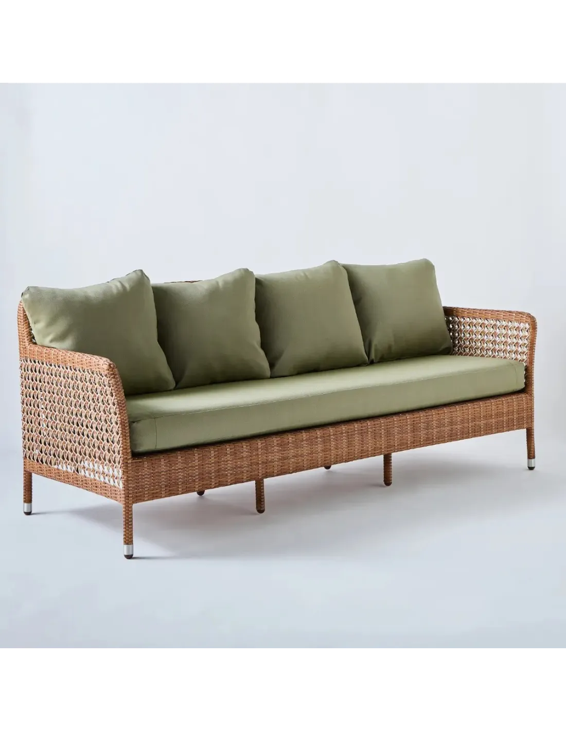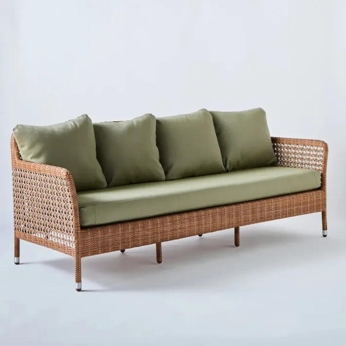 Overall dimensions: height 75 x width 190 x depth 75 cm, seat at 41 cm (with cushion), seat width (between armrests): 176 cm. Weight 21 kg with cushions. Powder-coated aluminum frame, braided in PEHD resin. Made in Indonesia. Seat cushions in 30 kg density polyurethane foam, back cushions in polyester wadding. All cushions are removable. All fabrics are UV- and mildew-resistant for outdoor use. 100% olefin grey chenille fabric. Plain and striped fabrics, 100% acrylic. Bouquet fabrics, 100% dralon. The cushion in grey chenille fabric is made in Indonesia (base price). Trimmings in other fabrics are made in France on request, subject to a lead time of around 3 weeks and an additional charge.
