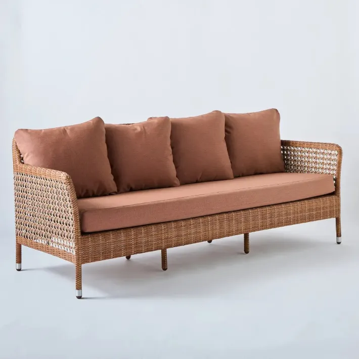 The laterite-colored Antibes resin 3-seater sofa combines sober lines and refined “double-skin” weaving, in keeping with the spirit of KOK MAISON. We pay homage to the centuries-old tradition of rattan weaving, the famous “French-style” open cane, by adapting it to the spirit of the times: wide-opening “mesh” for a more contemporary look, the use of a robust, easy-care outdoor resin, and a precious harmony of 3 beige browns in a range of shades, the darker dominant reproducing the warm tone of tropical rocks and earth. The slim armrests and backrest reduce the chair's bulk without sacrificing comfort. This revisited classic will fit in anywhere, even in small spaces, by the sea, but also in the setting of a characterful stone residence, a relais-château, a city terrace or a mountain chalet....