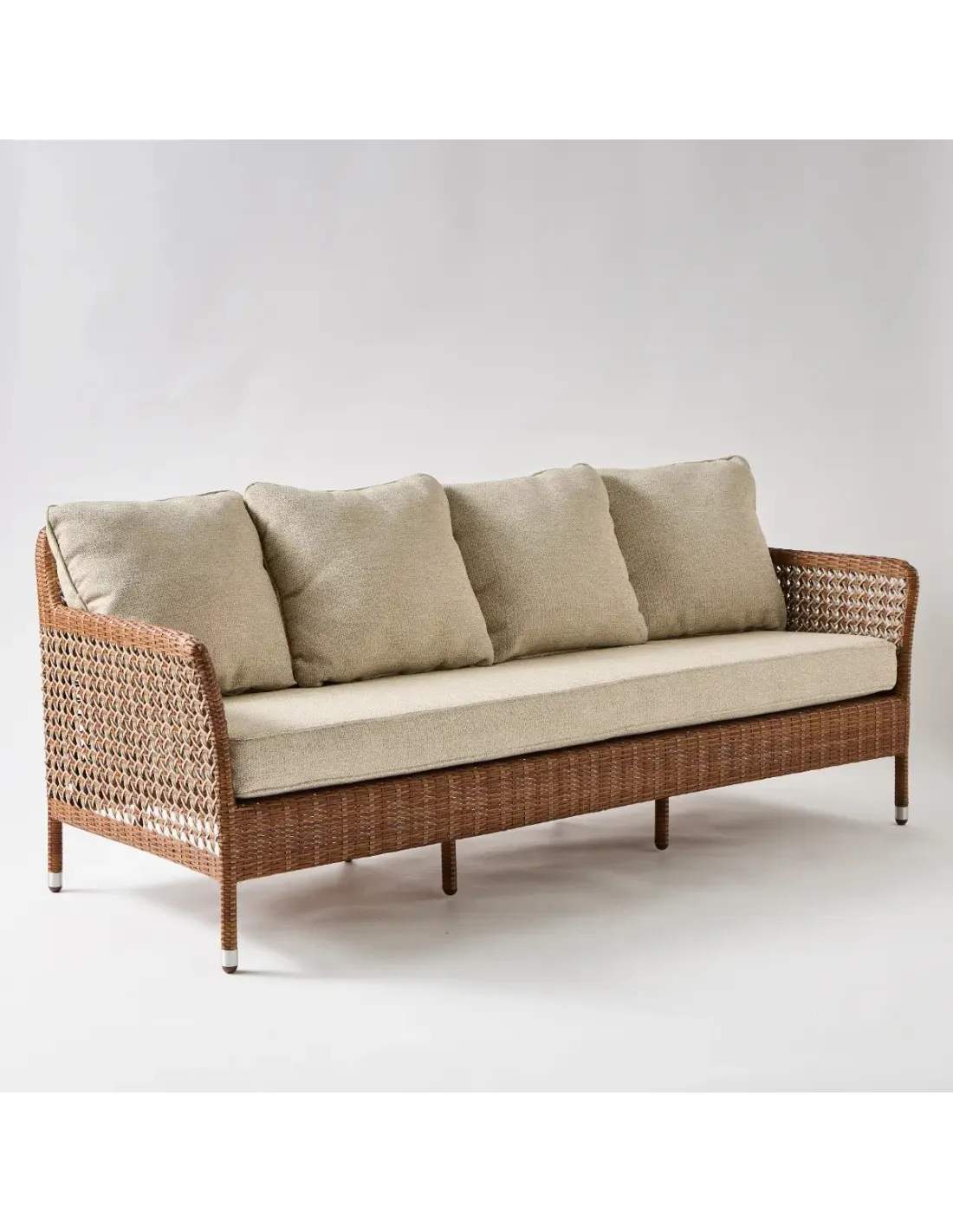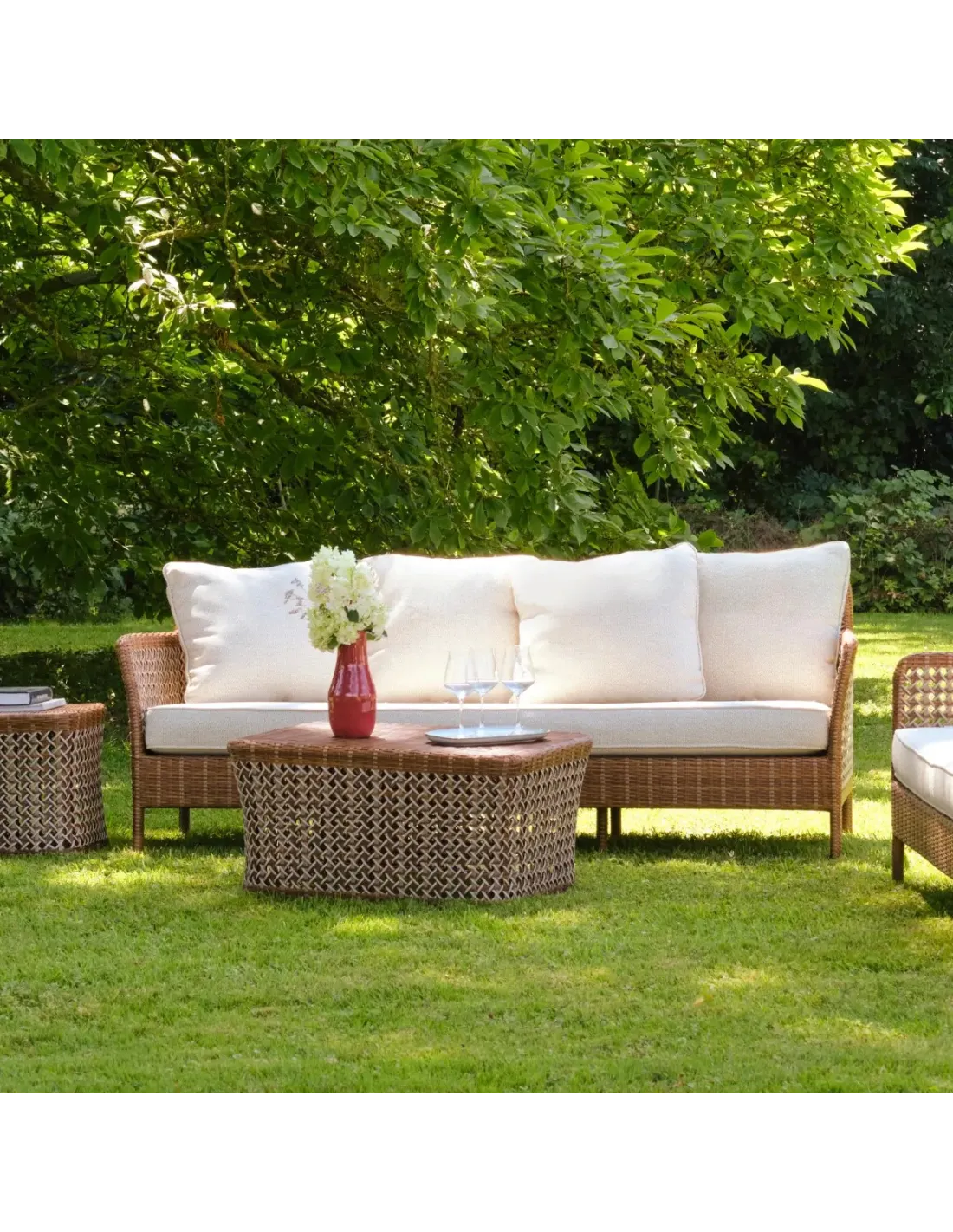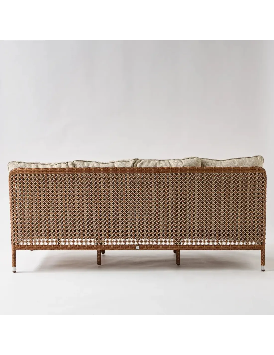 The laterite-colored Antibes resin 3-seater sofa combines sober lines and refined “double-skin” weaving, in keeping with the spirit of KOK MAISON. We pay homage to the centuries-old tradition of rattan weaving, the famous “French-style” open cane, by adapting it to the spirit of the times: wide-opening “mesh” for a more contemporary look, the use of a robust, easy-care outdoor resin, and a precious harmony of 3 beige browns in a range of shades, the darker dominant reproducing the warm tone of tropical rocks and earth. The slim armrests and backrest reduce the chair's bulk without sacrificing comfort. This revisited classic will fit in anywhere, even in small spaces, by the sea, but also in the setting of a characterful stone residence, a relais-château, a city terrace or a mountain chalet....