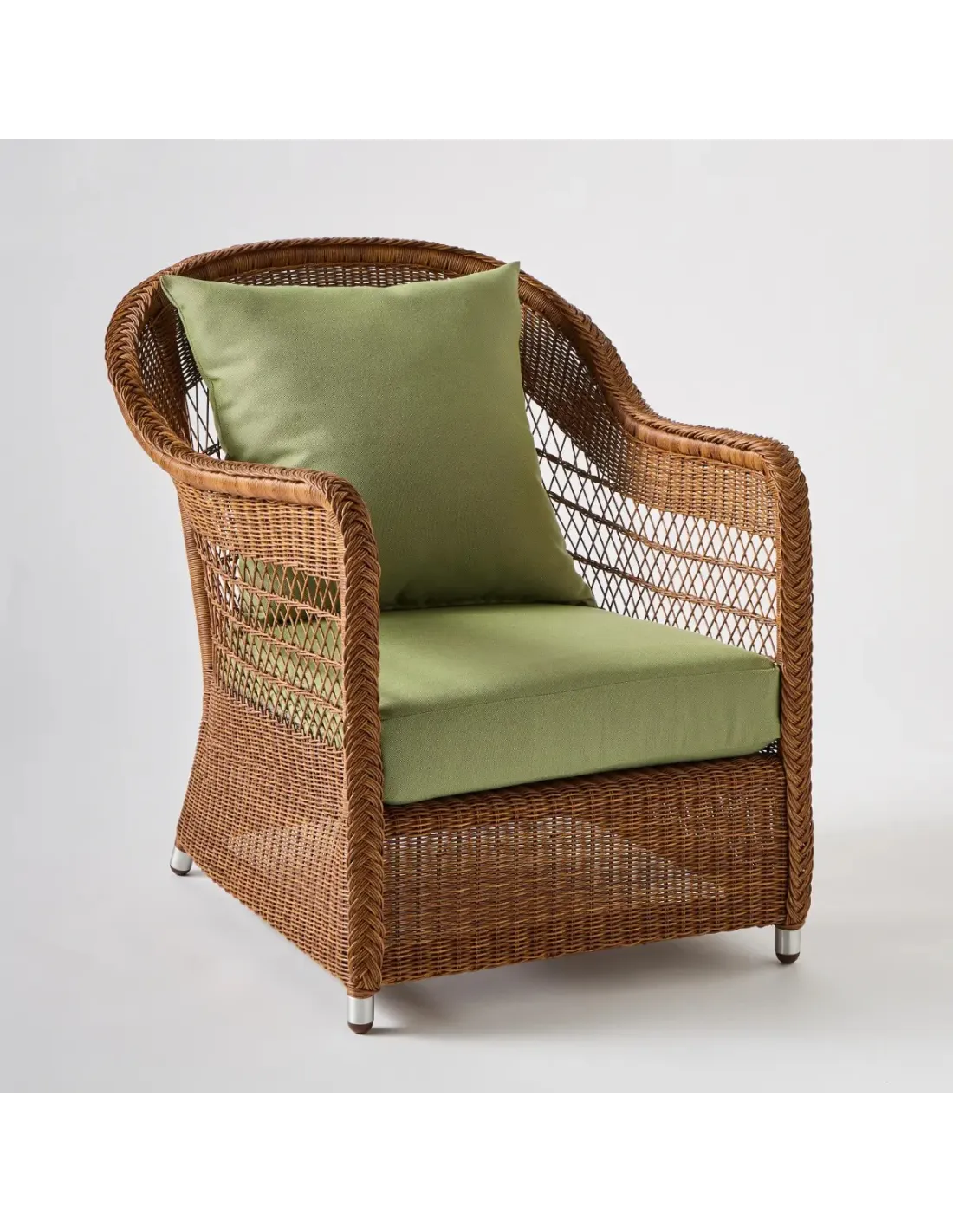 The BIARRITZ outdoor rattan armchair is shown here in châtaigne-colored resin with our selection of outdoor fabrics. The BIARRITZ collection is inspired by the rattan and willow furniture found under awnings and in the conservatories of late 19th-century bourgeois homes. In particular, they feature the typical “openwork” weave, with diamond-shaped patterns in the open parts. The use of a resin as fine as it is resistant further enhances the impression of lightness and refinement of this exclusive lace-like weaving.