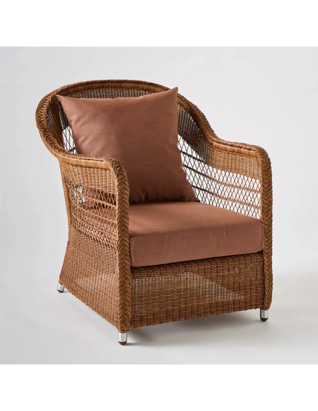 The BIARRITZ outdoor rattan armchair is shown here in châtaigne-colored resin with our selection of outdoor fabrics. The BIARRITZ collection is inspired by the rattan and willow furniture found under awnings and in the conservatories of late 19th-century bourgeois homes. In particular, they feature the typical “openwork” weave, with diamond-shaped patterns in the open parts. The use of a resin as fine as it is resistant further enhances the impression of lightness and refinement of this exclusive lace-like weaving.