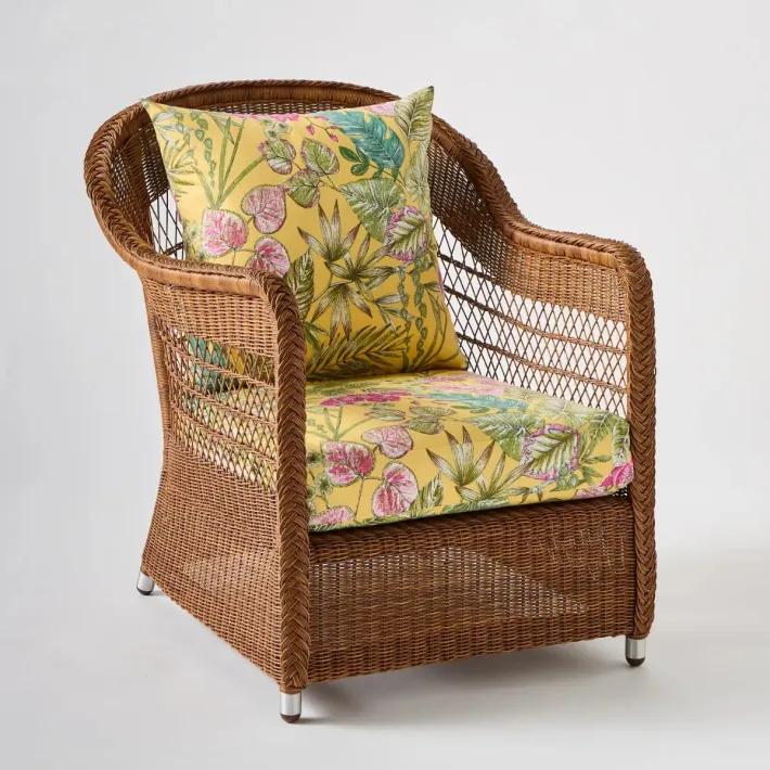 The BIARRITZ outdoor rattan armchair is shown here in châtaigne-colored resin with our selection of outdoor fabrics. The BIARRITZ collection is inspired by the rattan and willow furniture found under awnings and in the conservatories of late 19th-century bourgeois homes. In particular, they feature the typical “openwork” weave, with diamond-shaped patterns in the open parts. The use of a resin as fine as it is resistant further enhances the impression of lightness and refinement of this exclusive lace-like weaving.