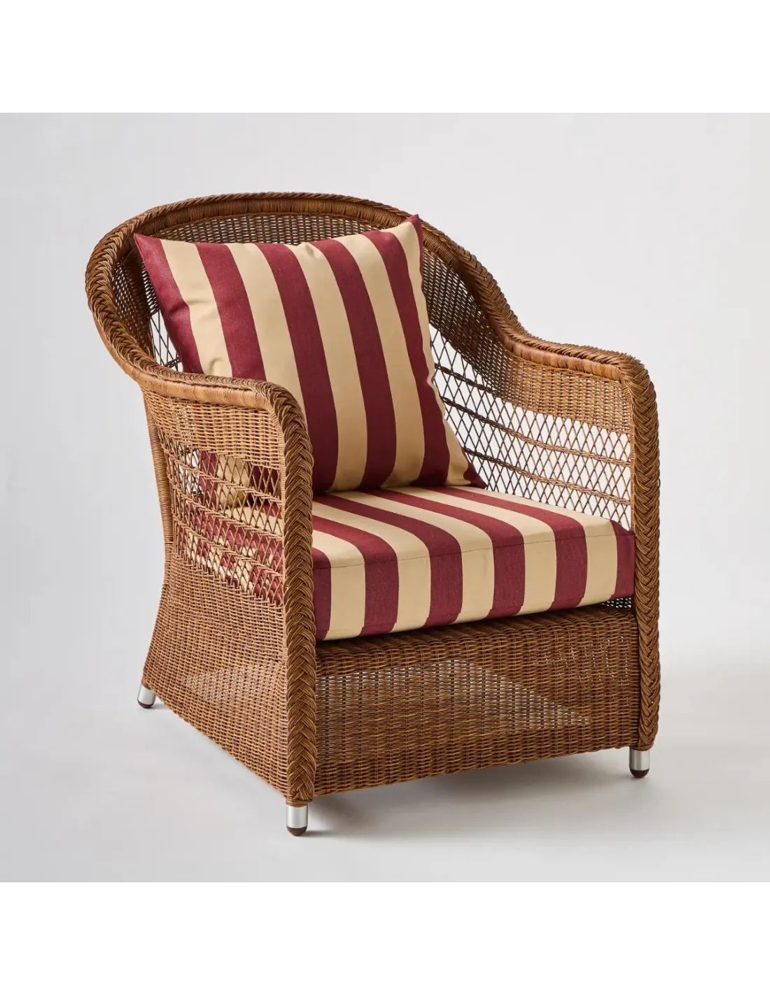 Overall dimensions: height 81 x width 71 x depth 81 cm, seat at 38 cm (with cushion). Weight 11 kg with cushions. Powder-coated aluminum frame, woven in PEHD resin, made in Indonesia.  Seat cushion in 30 kg density polyurethane foam, back cushion in polyester wadding. Both cushions are removable. All fabrics are UV- and mildew-resistant for outdoor use. Grey chenille fabric, 100% olefin. Plain and striped fabrics, 100% acrylic. Bouquet fabric, 100% dralon. The cushion in gray chenille fabric is made in Indonesia (base price). Upholstery in other fabrics is made in France on request, subject to a lead time of around 3 weeks and a surcharge.