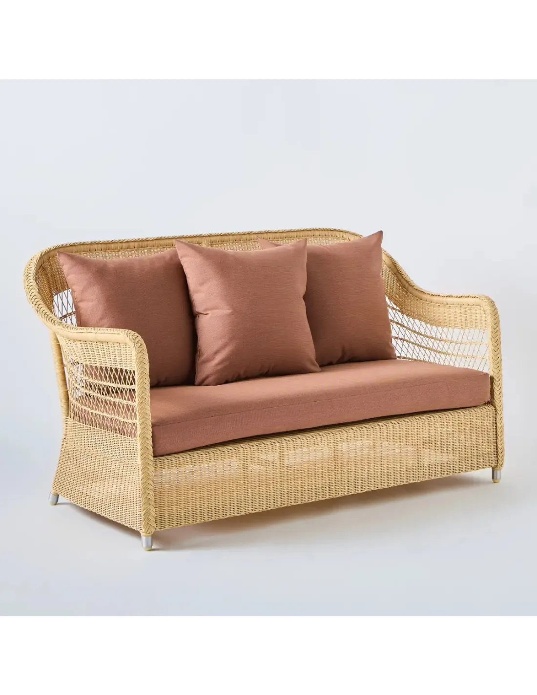 The BIARRITZ 2-seater outdoor rattan sofa is presented here in natural resin with our selection of outdoor fabrics. The BIARRITZ collection is inspired by the rattan and willow furniture found under porches and in the conservatories of late 19th-century bourgeois homes. In particular, they feature the typical “openwork” weave, with diamond-shaped motifs in the openwork areas. The use of a resin that is as fine as it is resistant further enhances the impression of lightness and refinement of this exclusive, lace-like weaving. The Biarritz 2-seater sofa is practically a 2 1/2-seater. With its 125 cm seat width, it can accommodate 2 very comfortable people, or 3 more tightly packed. That's why we've included 3 back cushions as standard.