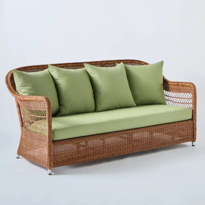 The BIARRITZ 3-seater outdoor rattan sofa is presented here in chataigne-colored resin with our selection of outdoor fabrics. The BIARRITZ collection is inspired by the rattan and willow furniture found under porches and in the conservatories of late 19th-century bourgeois homes. In particular, they feature the typical “openwork” weave, with diamond-shaped patterns in the open parts. The use of a resin that is as fine as it is resistant further enhances the impression of lightness and refinement of this exclusive, lace-like weaving.