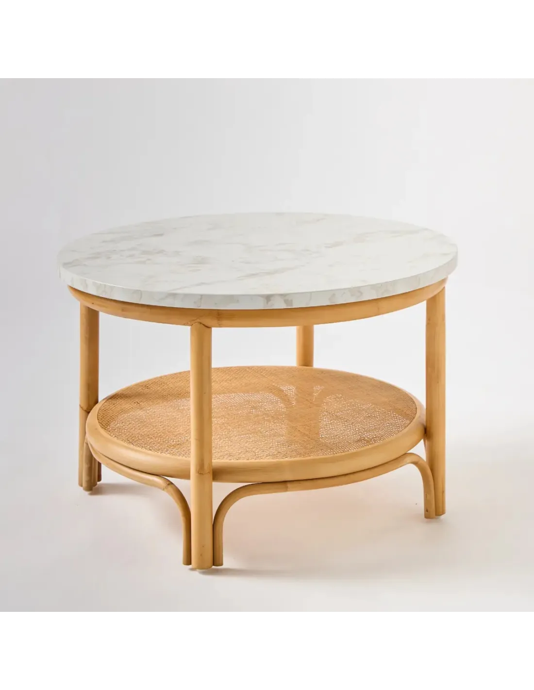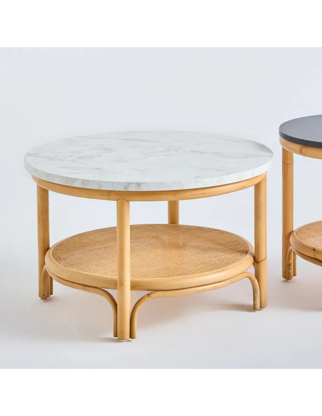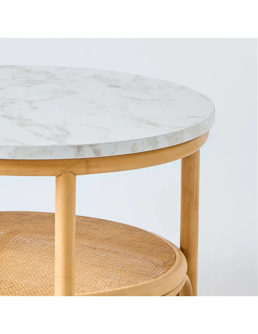 Inspired by the rattan designs of the 1970s and 1980s, the Riviera collection in natural rattan echoes the characteristic graphic codes of that era: large-diameter rattan, simple and refined shapes, and cane work for the magazine rack. But here, there are no bright colors as there were back then. We preferred a “natural” treatment that ultimately makes it very contemporary: the rattan is semi-debarked to leave the knots partially visible, with a slight amber coloring to even out the overall look and a transparent satin varnish. This opulent and timeless rattan coffee table will be just as at home in a “veranda” or “winter garden” setting as it will be among contemporary furniture, which it will help to warm up. To make it even more refined, we have fitted it with a laminate top in white or black marble. Laminate or HPL (high pressure laminated) is what kitchen worktops are made of. It is particularly durable and easy to maintain. Chic and practical.