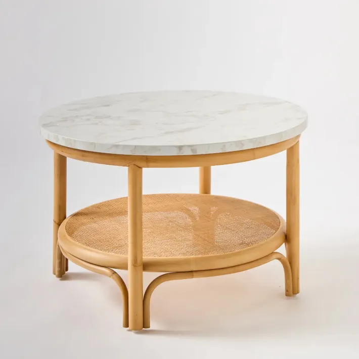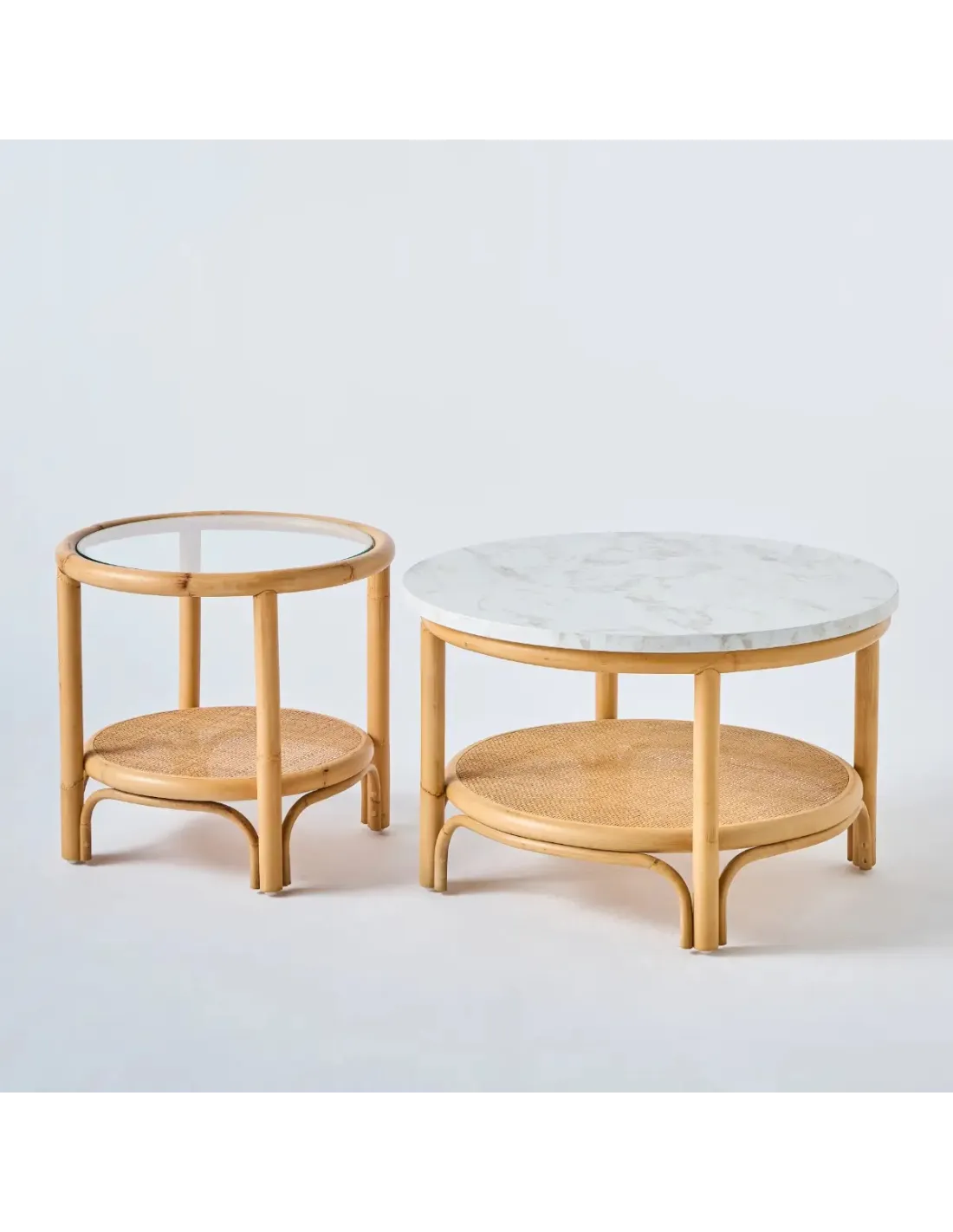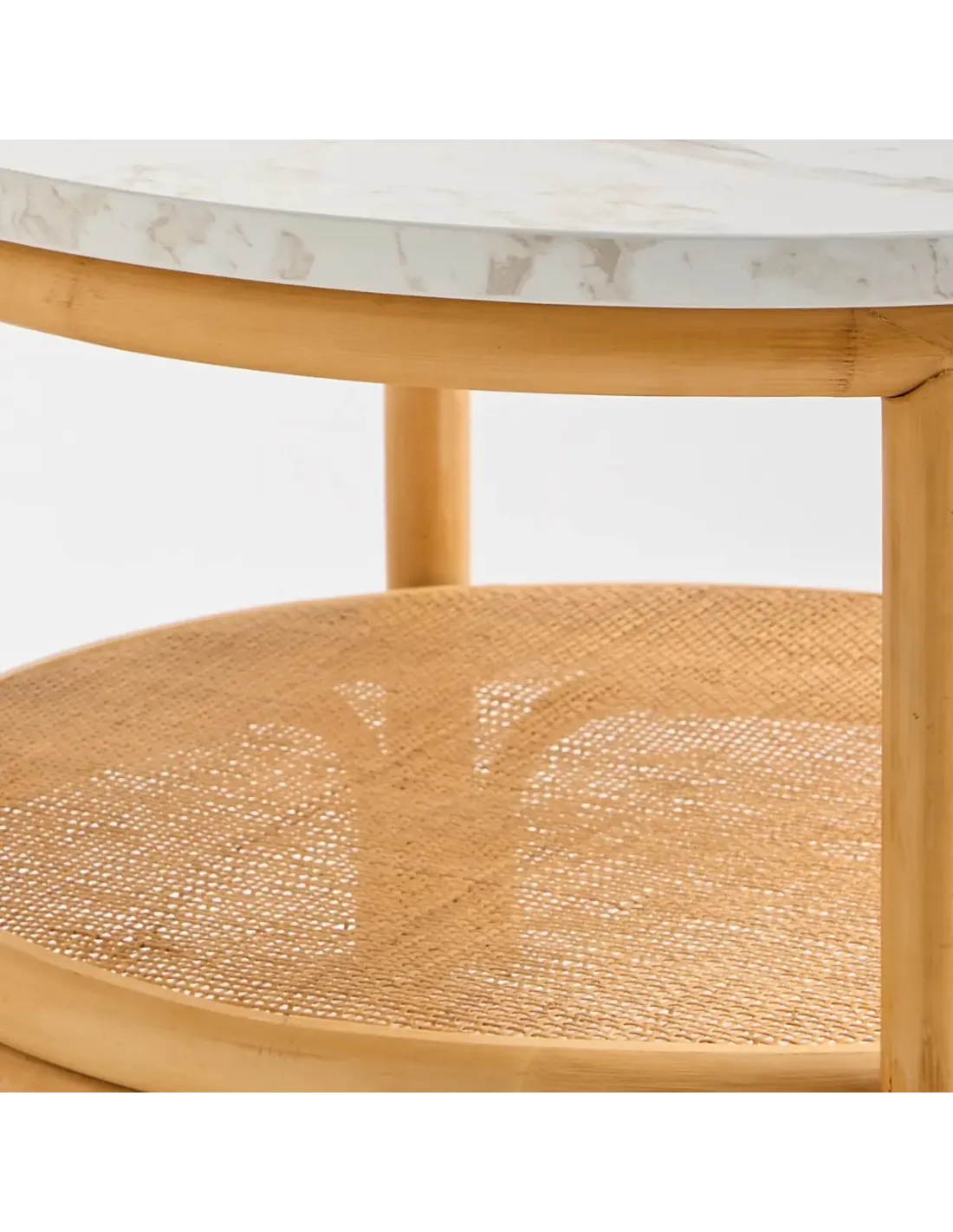 Inspired by the rattan designs of the 1970s and 1980s, the Riviera collection in natural rattan echoes the characteristic graphic codes of that era: large-diameter rattan, simple and refined shapes, and cane work for the magazine rack. But here, there are no bright colors as there were back then. We preferred a “natural” treatment that ultimately makes it very contemporary: the rattan is semi-debarked to leave the knots partially visible, with a slight amber coloring to even out the overall look and a transparent satin varnish. This opulent and timeless rattan coffee table will be just as at home in a “veranda” or “winter garden” setting as it will be among contemporary furniture, which it will help to warm up. To make it even more refined, we have fitted it with a laminate top in white or black marble. Laminate or HPL (high pressure laminated) is what kitchen worktops are made of. It is particularly durable and easy to maintain. Chic and practical.