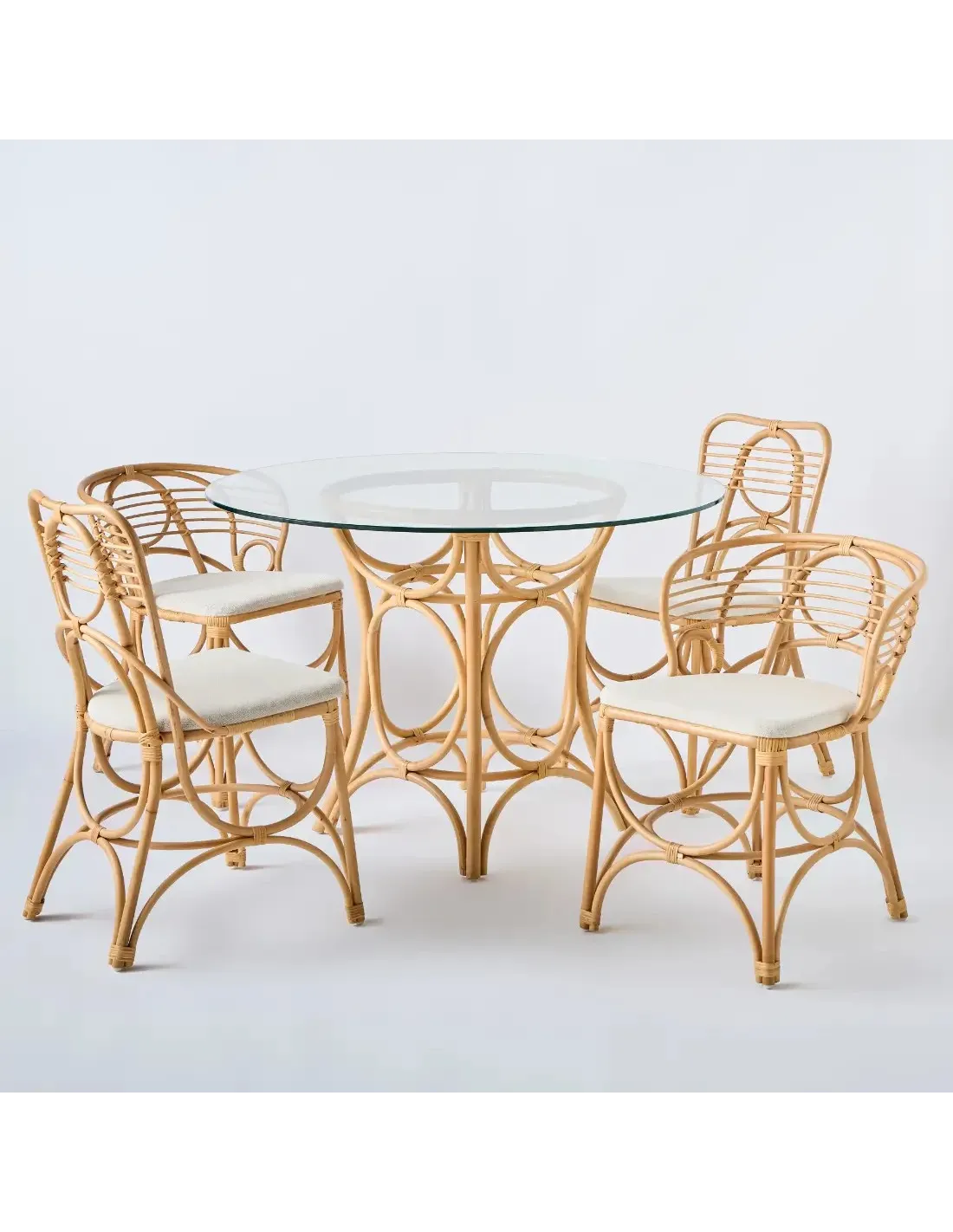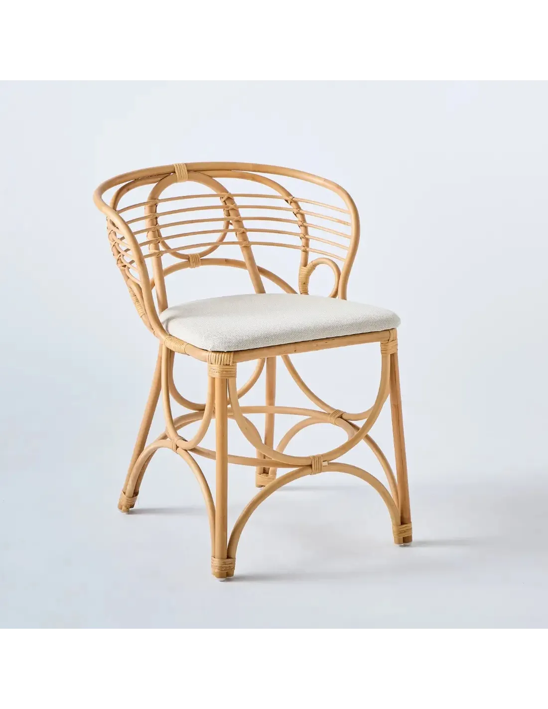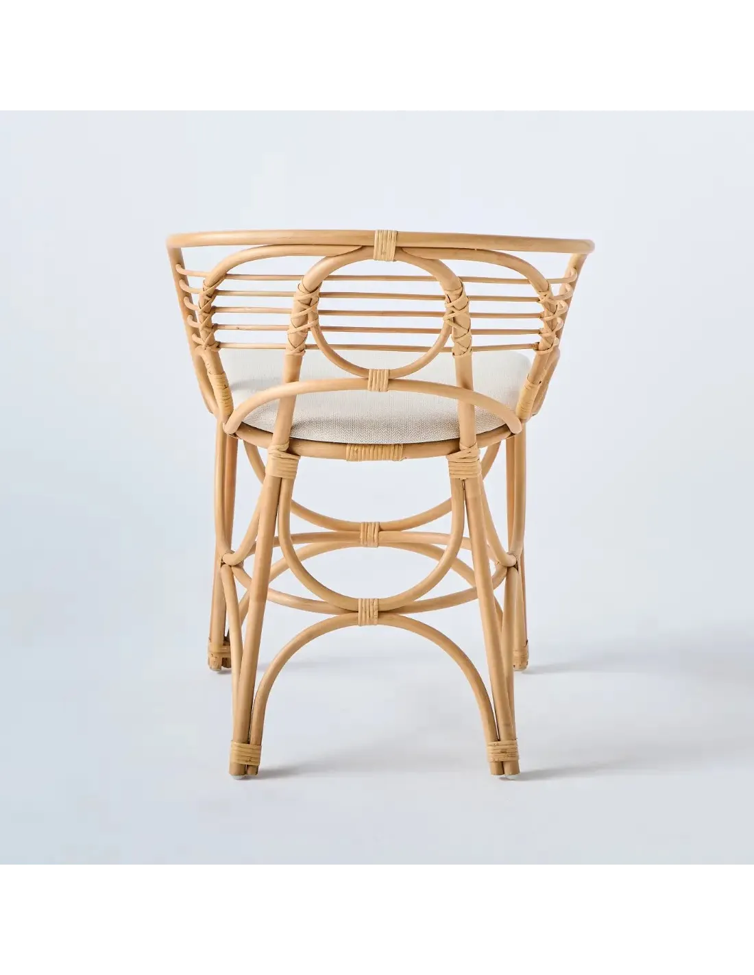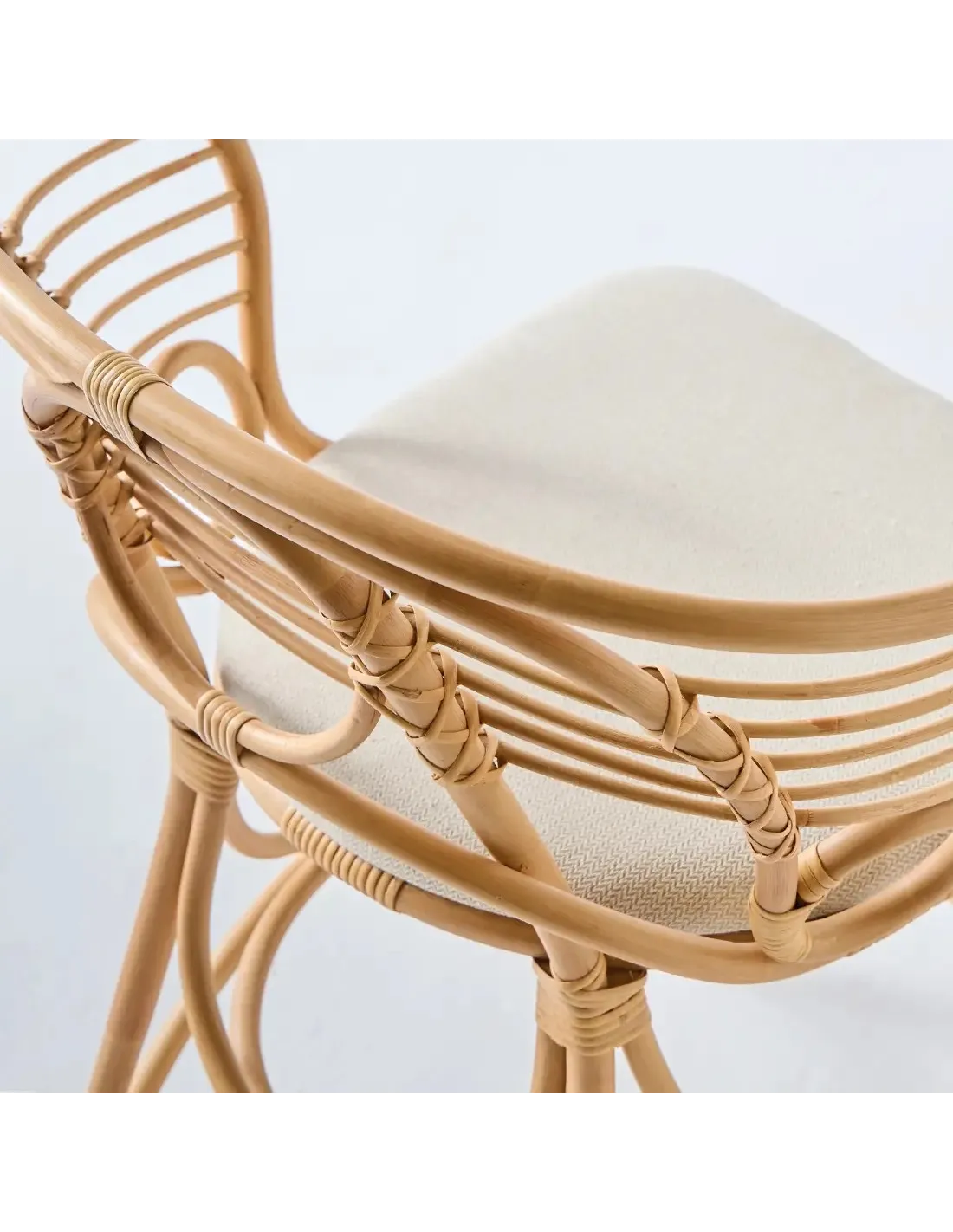 Structure in peeled rattan cane, seat woven and tied with rattan splints, natural water-based varnish finish. Cushion in polyurethane foam with a density of 30 kg/m3 on plywood screwed to the chair, covered with linen-cotton fabric. Each leg is fitted with a nylon glide.