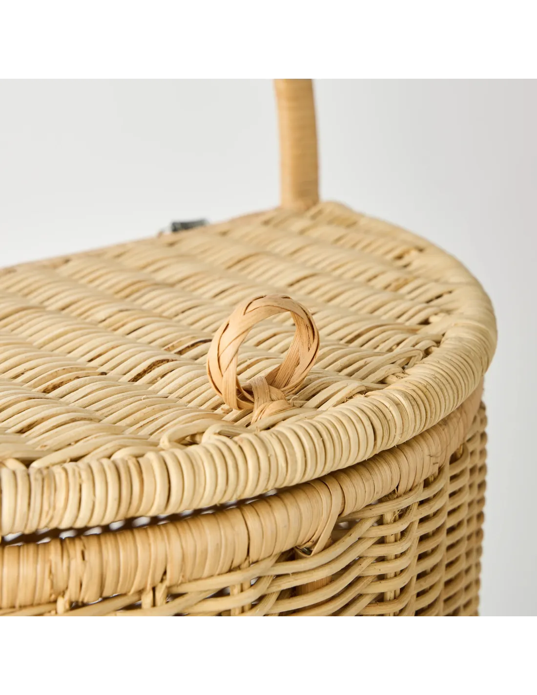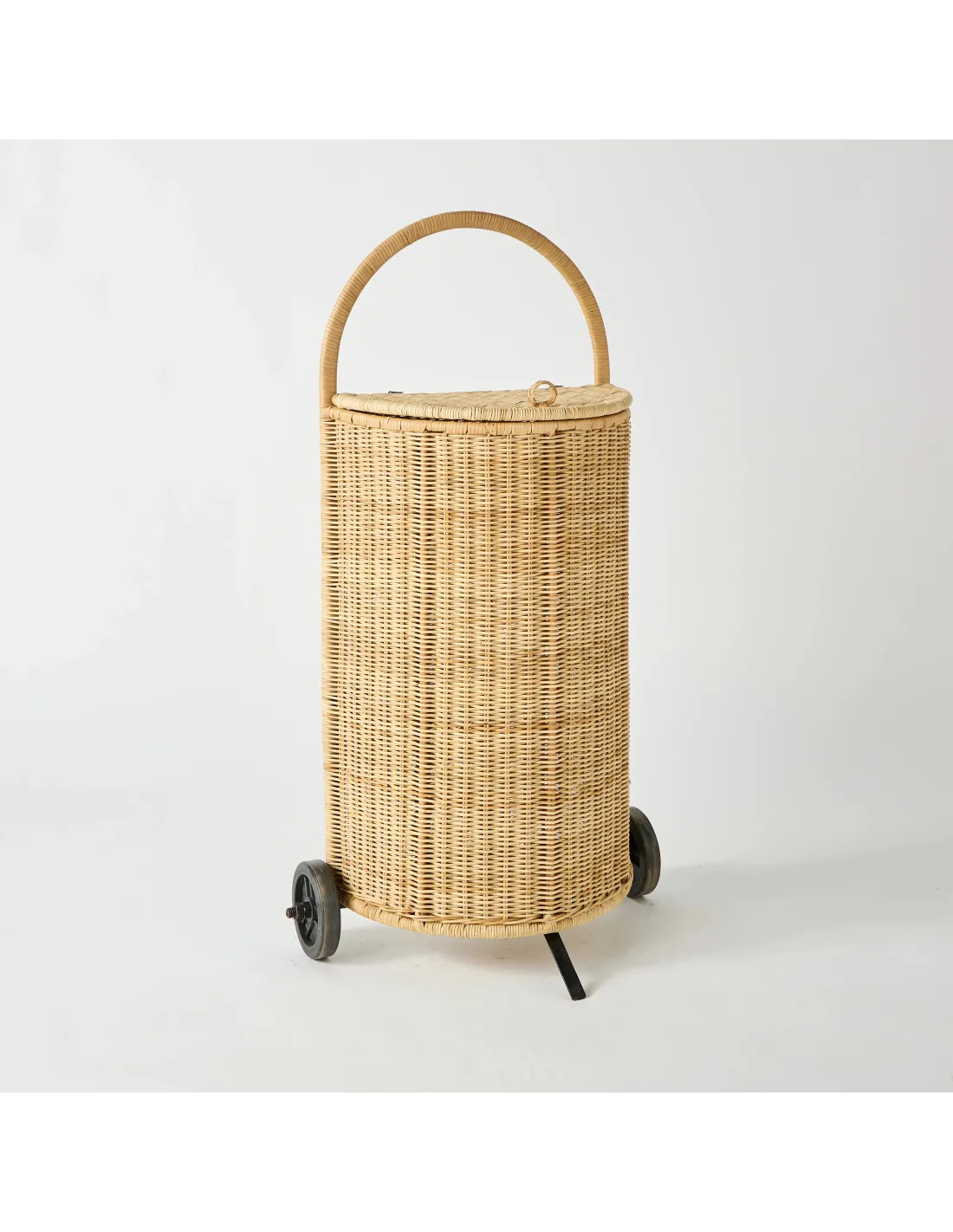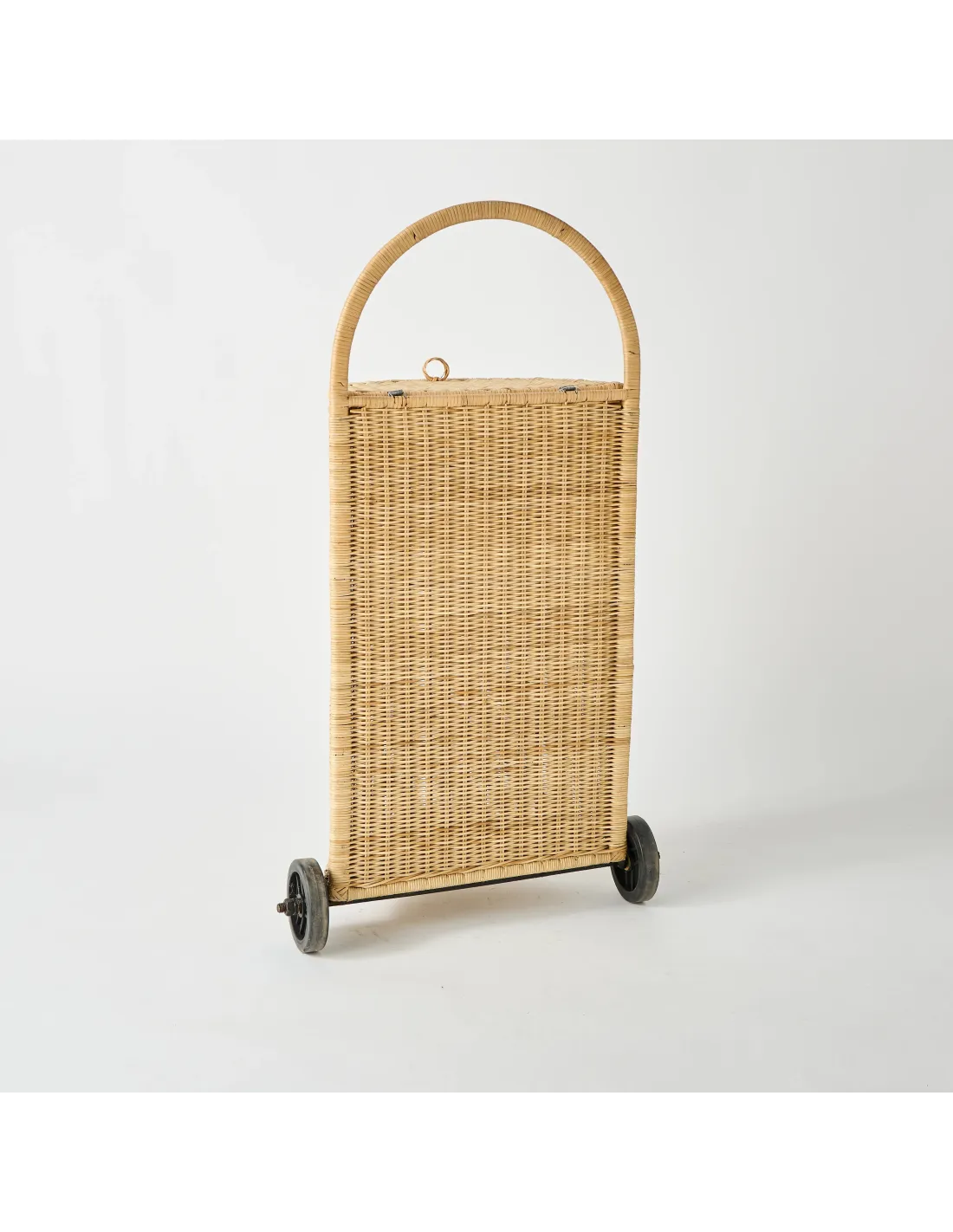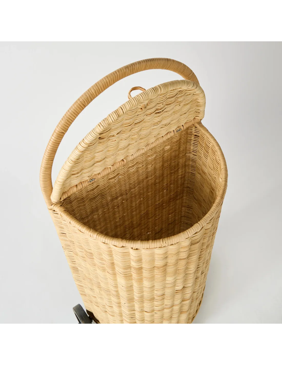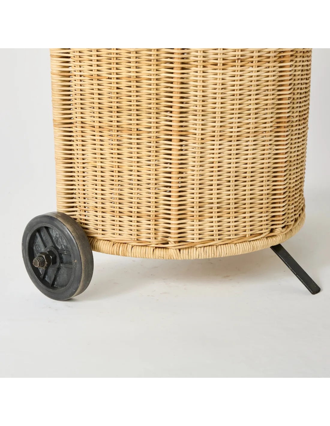 Rattan frame covered with fine, unpeeled rattan weaving. HDPE (high-density polyethylene) wheels on metal axles.