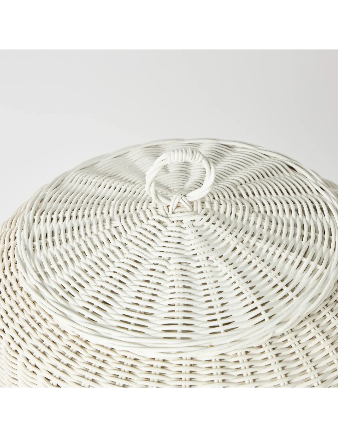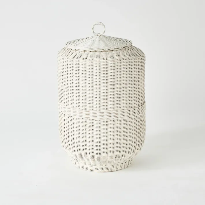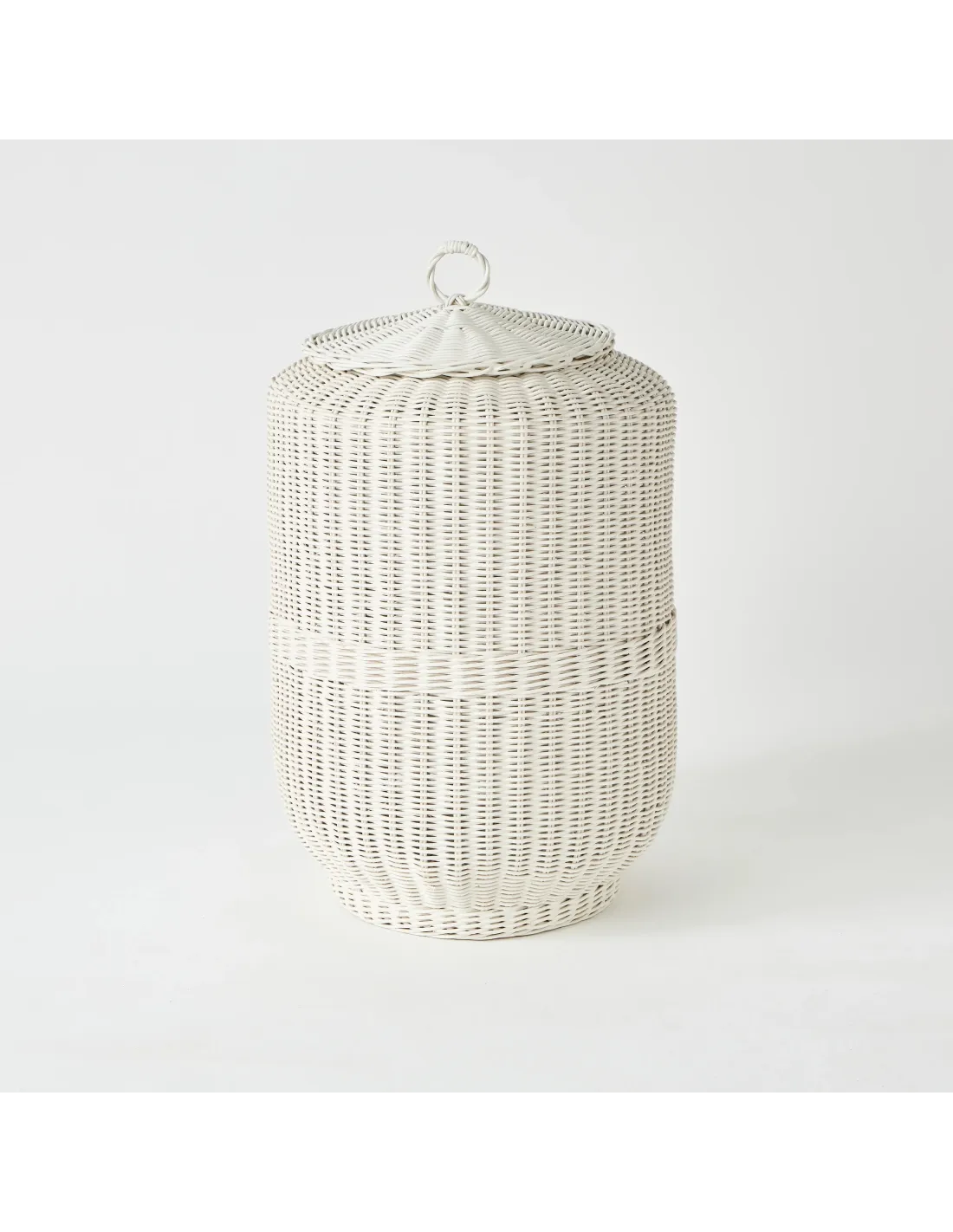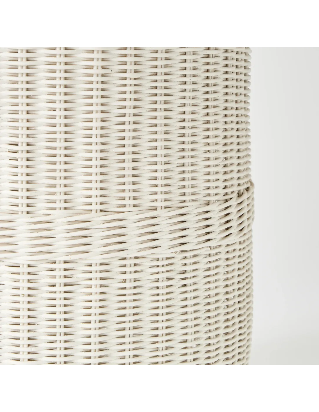 White lacquered natural rattan weave. Height 57 cm x diameter 35 cm. Weight 1 kg. Made in Indonesia.