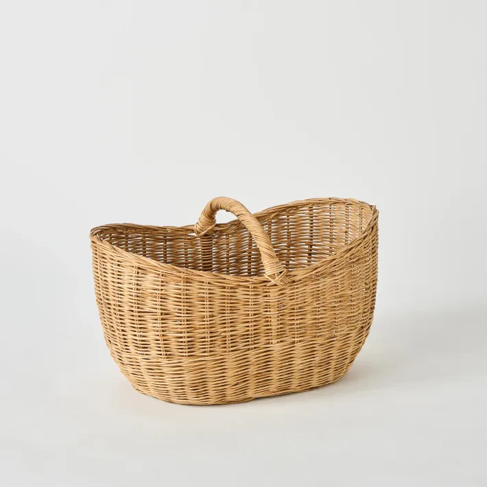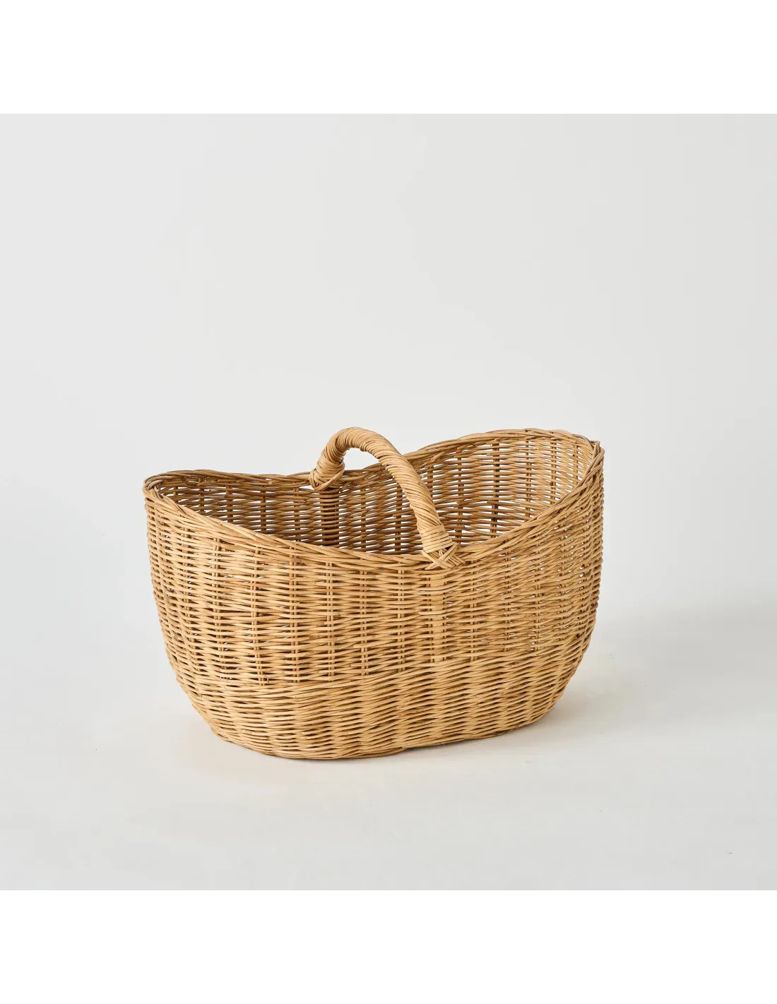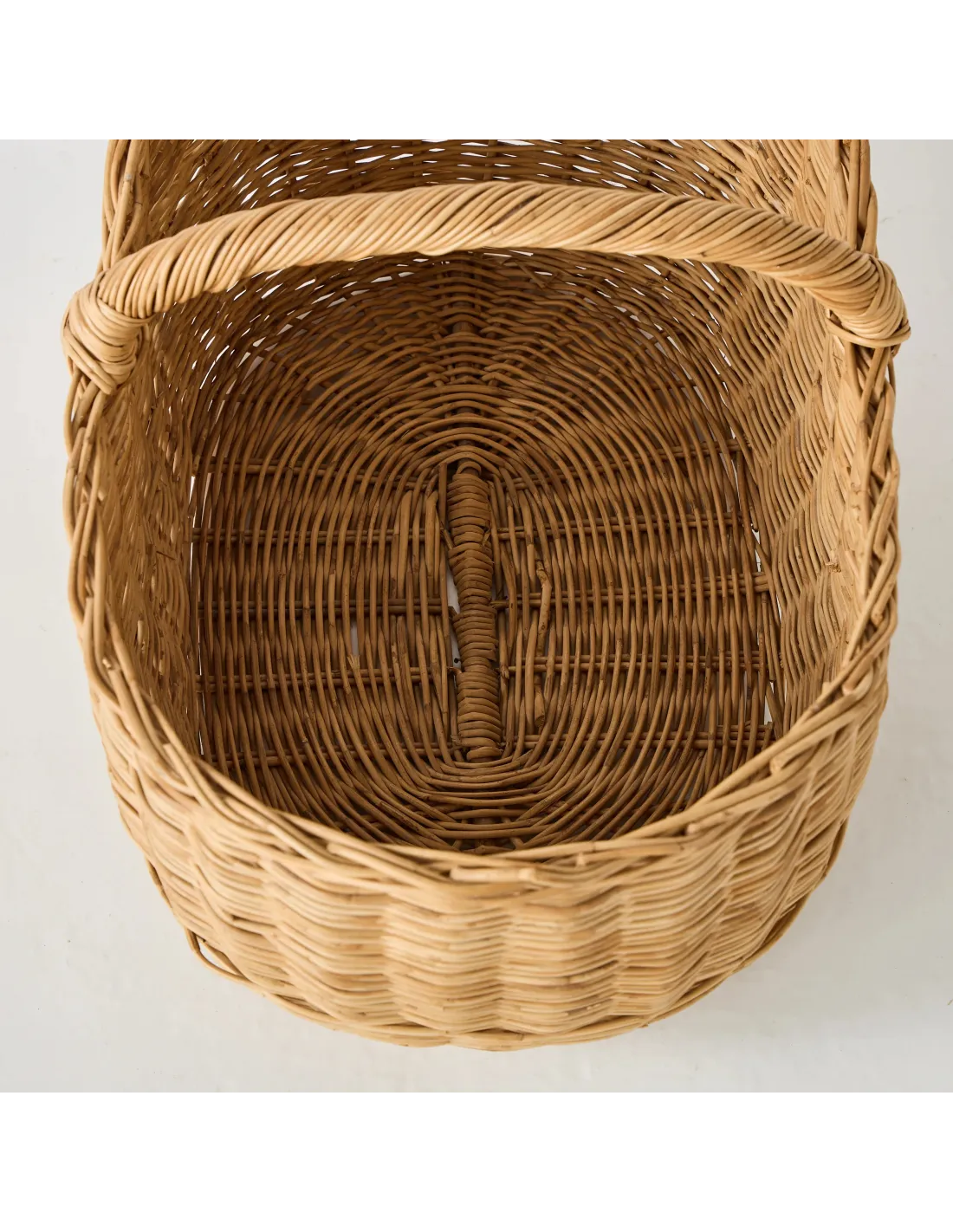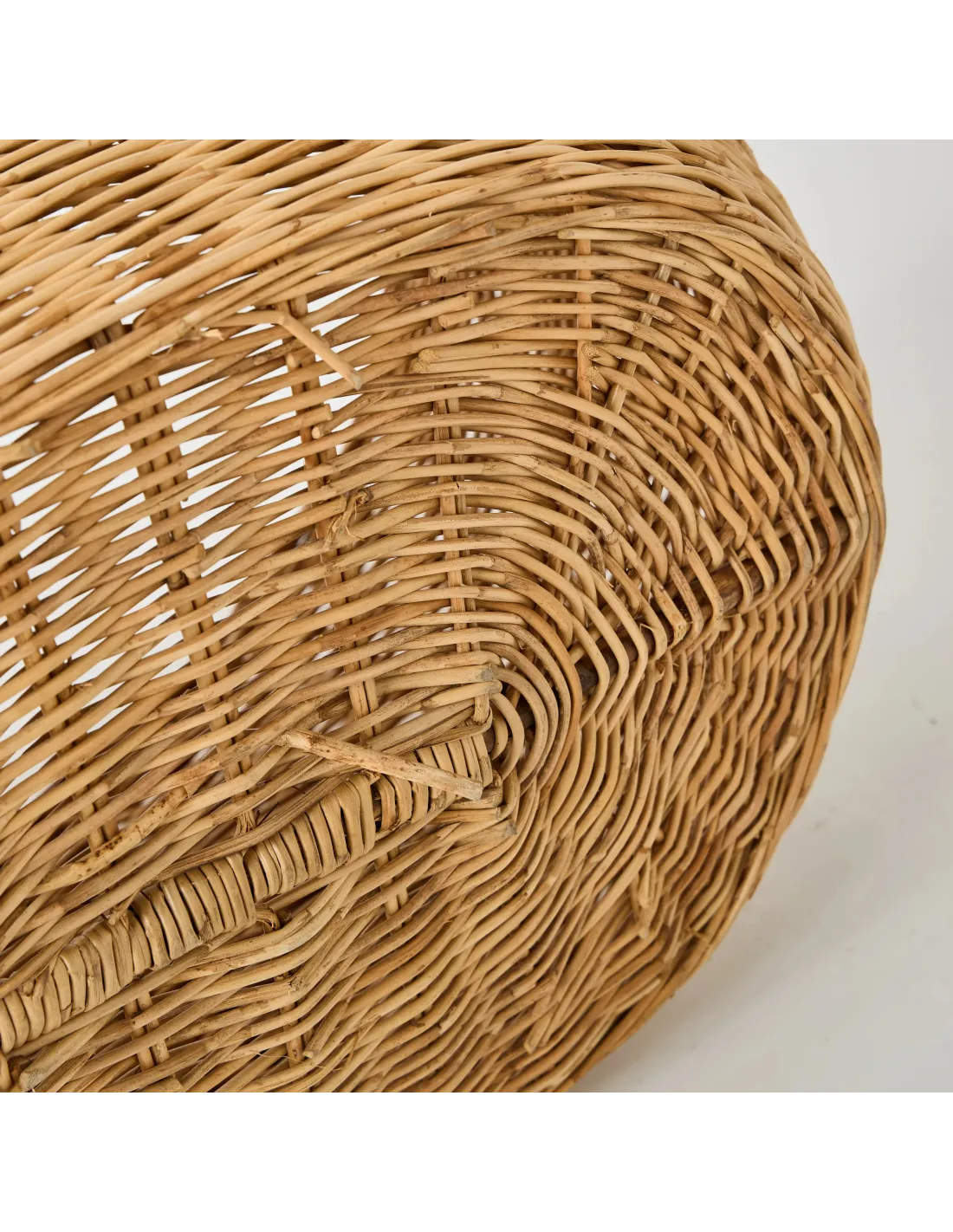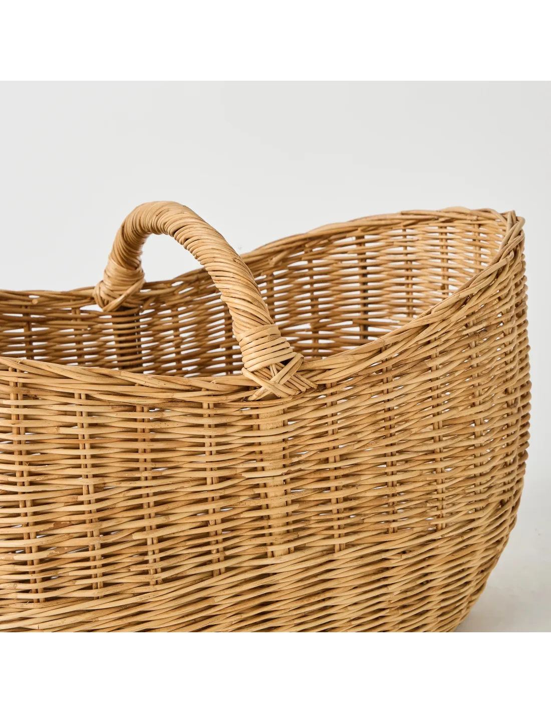 Natural rattan weave. Height 35 cm (with handle) 23 cm (lowest point of the basket) x width 34 cm x length 54 cm. Weight 1 kg. Made in Vietnam.