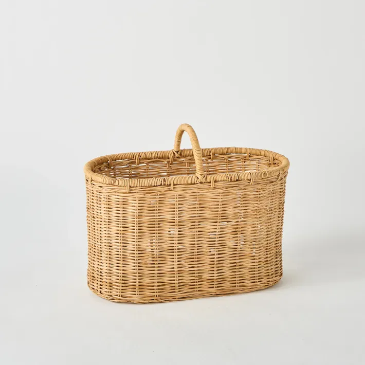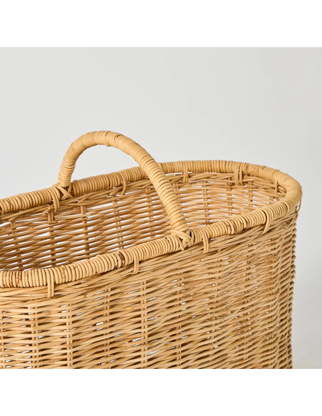 Natural rattan weave. Height 41 cm (with handle) 29 cm (basket only) x width 27 cm x length 49 cm. Weight 800 g. Made in Vietnam.