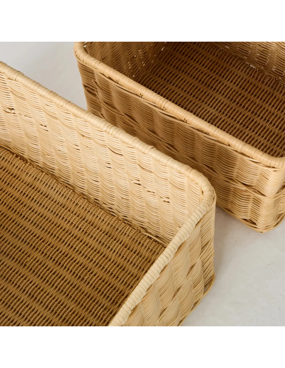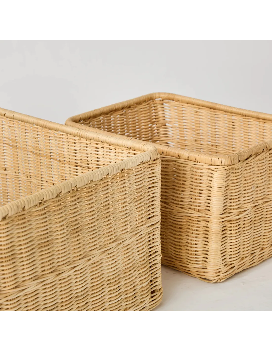 A set of storage baskets combining the natural blond colour of rattan with fine weaving.