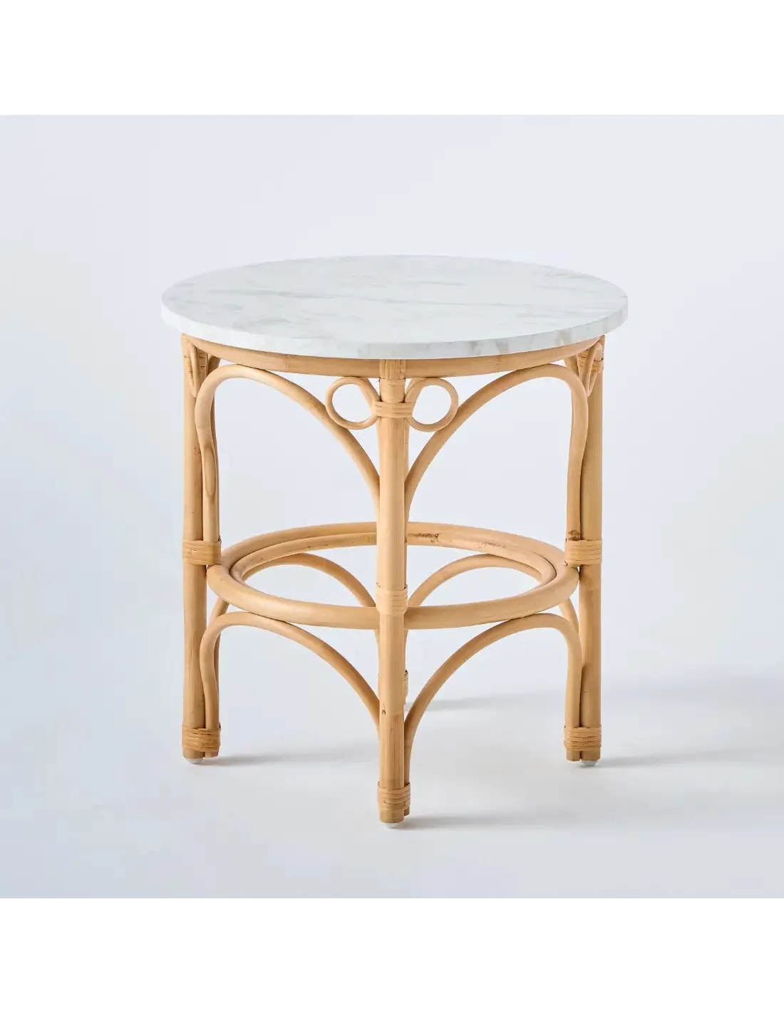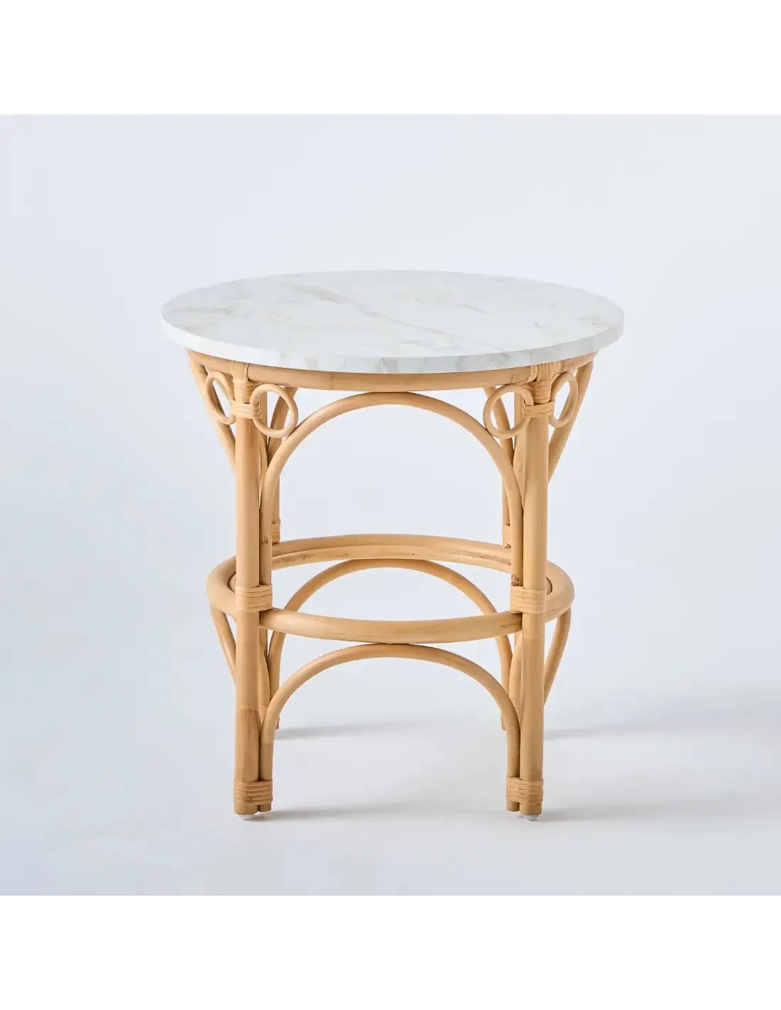 Half-barked rattan cane structure, rattan splint bindings, natural water-based varnish finish. Each leg is fitted with a nylon glide. 18 mm thick, 50 cm diameter HPL (High Pressure Laminated) marble effect laminate top.