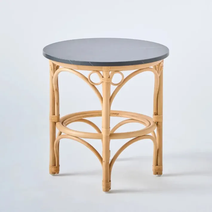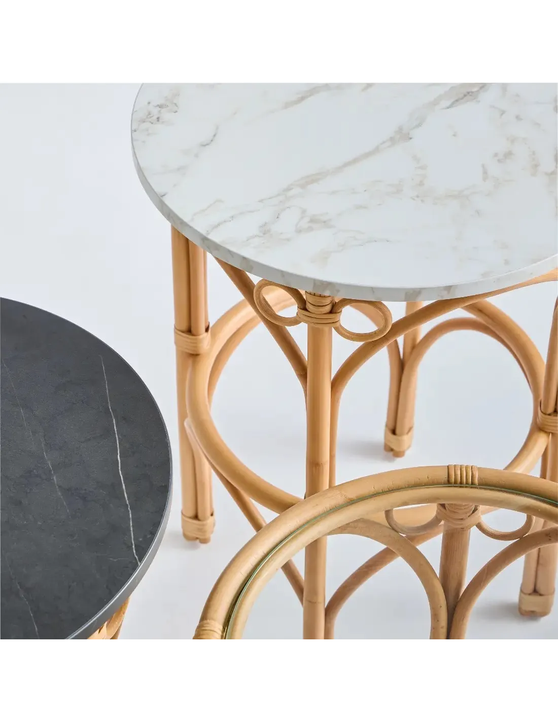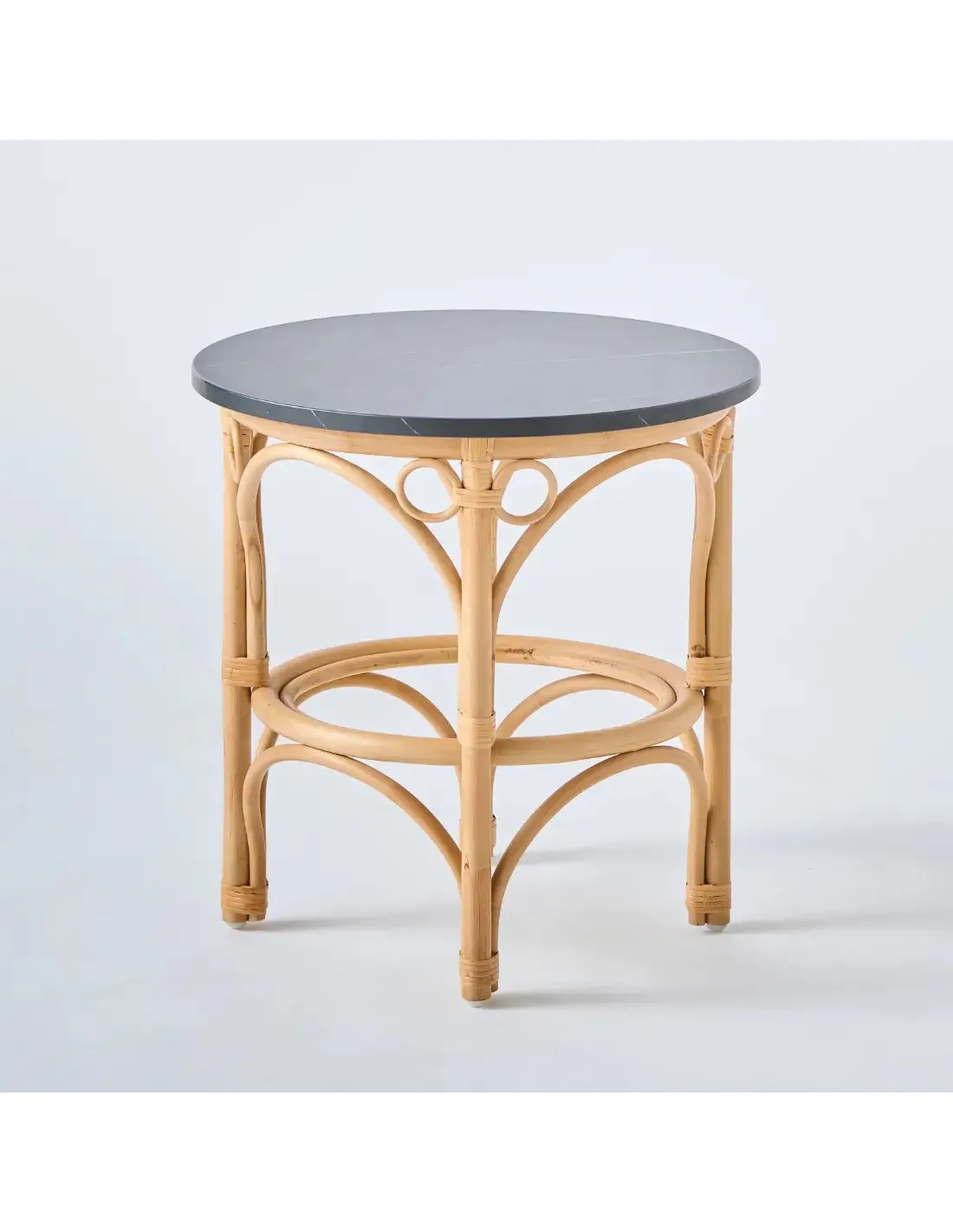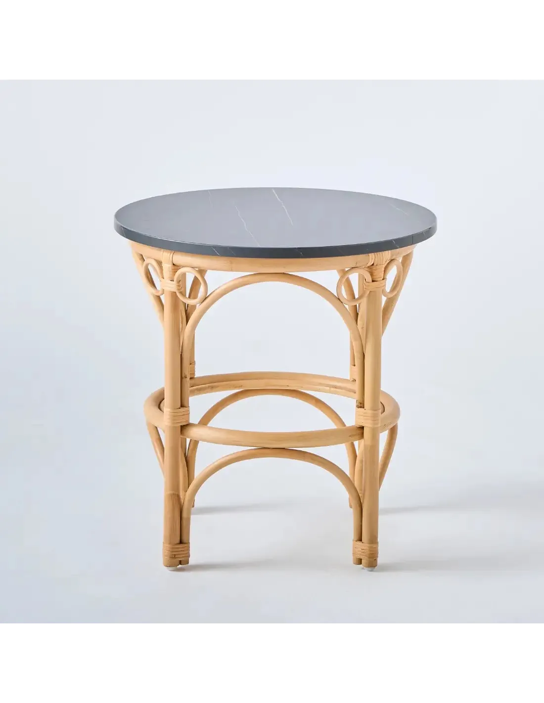 Half-barked rattan cane structure, rattan splint bindings, natural water-based varnish finish. Each leg is fitted with a nylon glide. 18 mm thick, 50 cm diameter HPL (High Pressure Laminated) marble effect laminate top.