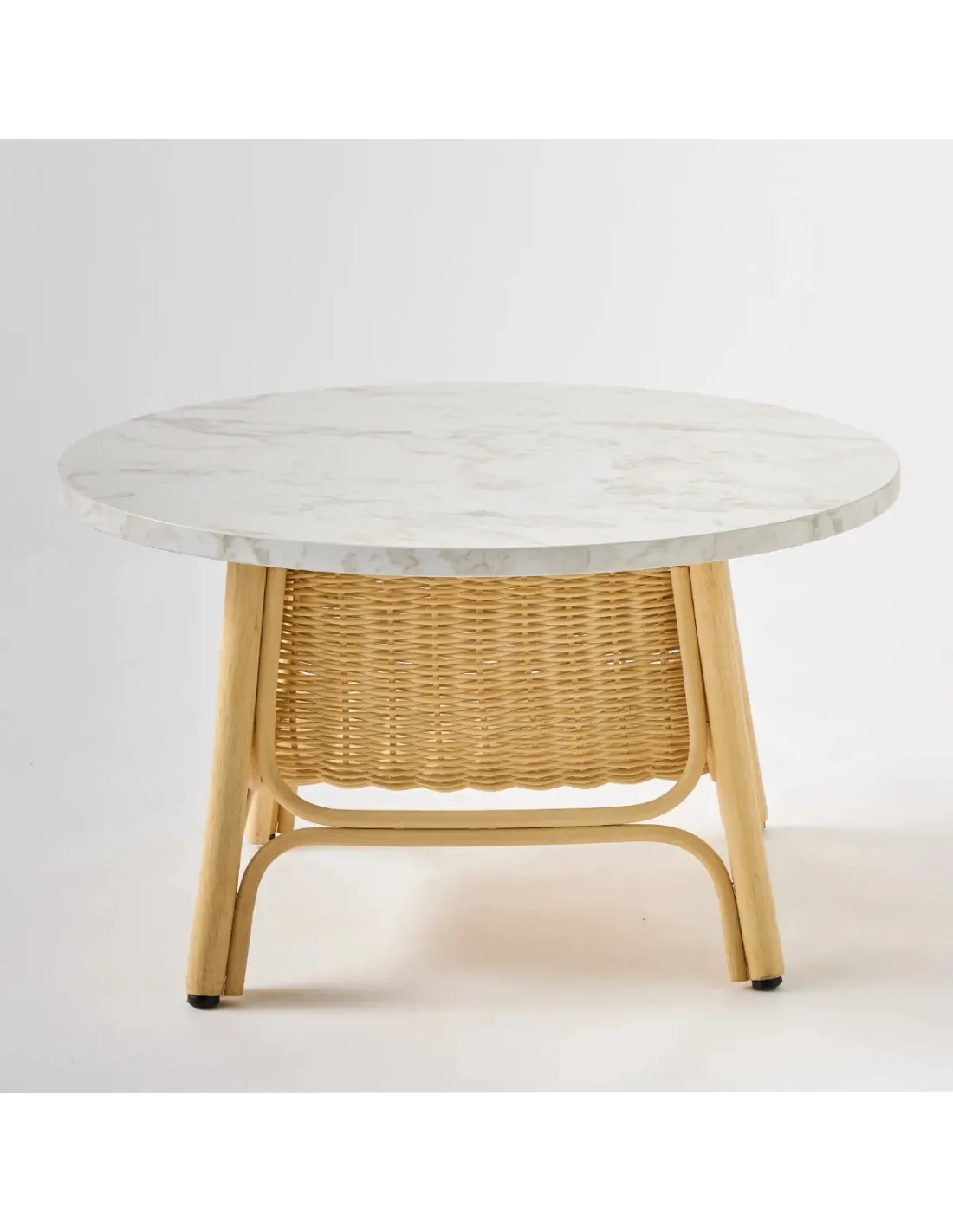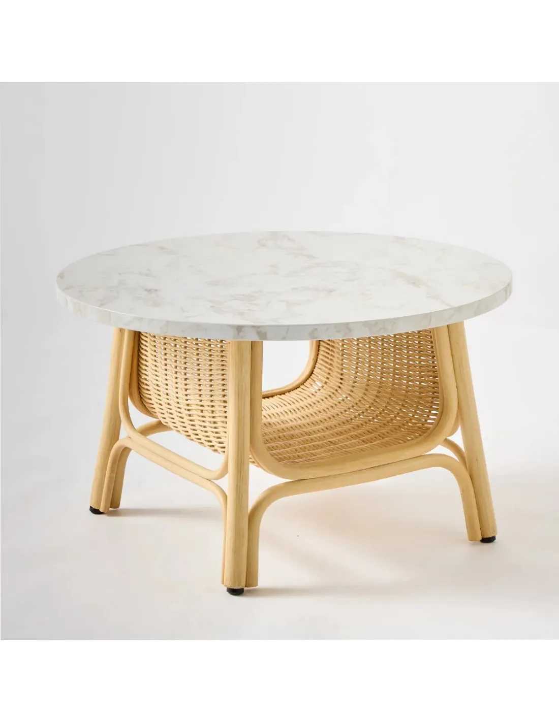 Structure: barked rattan cane. Magazine rack woven in natural rattan core. Water-based matt lacker finish. Featuring a white or black marble-effect laminate top. Laminate or HPL (high pressure laminate) is used to make kitchen countertops; it is particularly durable and easy to maintain.Each foot is fitted with double-sided pads (one nylon side, one felt side) that can be easily swapped and replaced. Outside measurements: diameter 70 cm x height 40 cm. Weight 8 kg. Made in Indonesia. Delivered fully assembled.