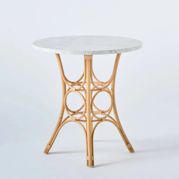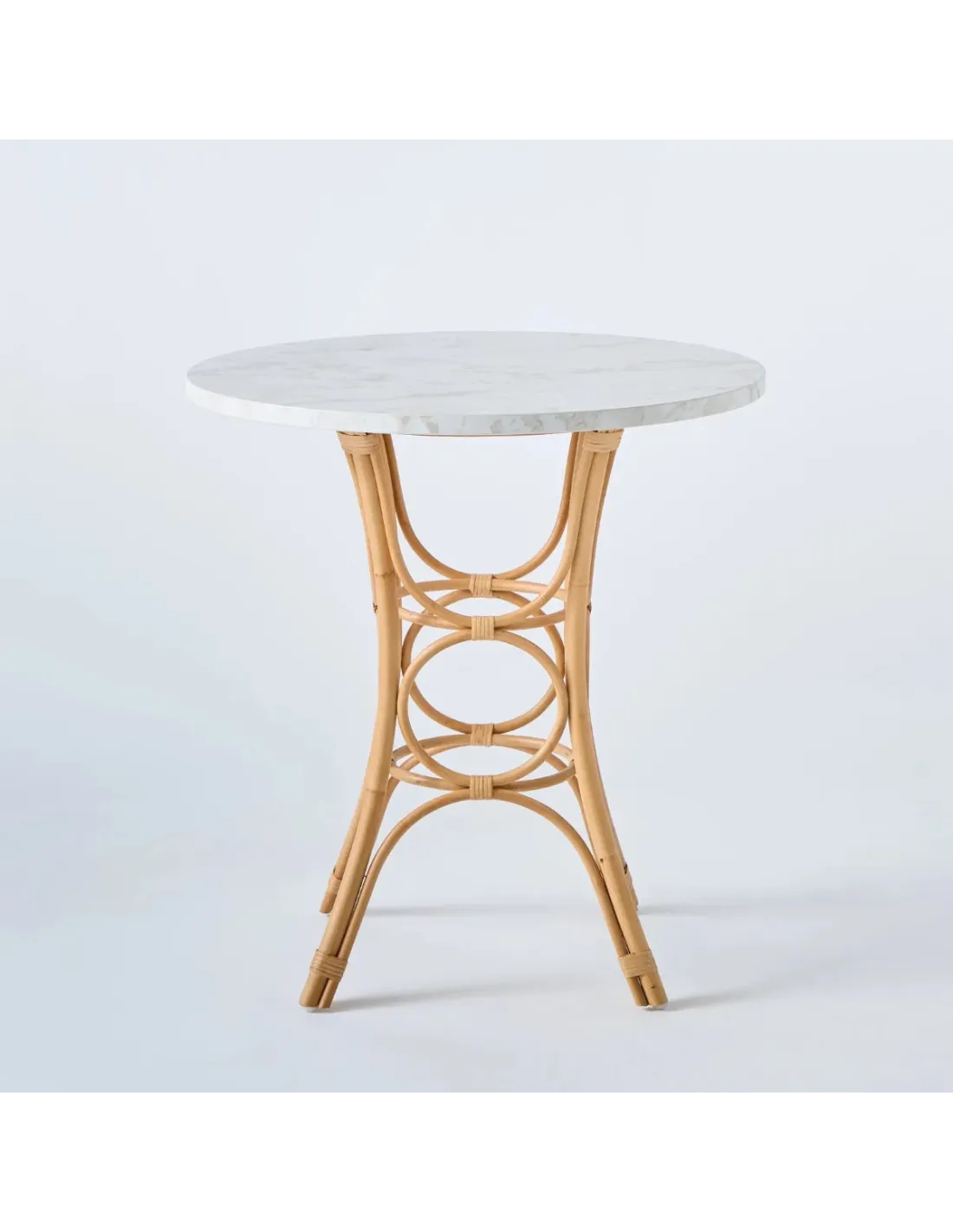 Half-decorated rattan cane frame with rattan splint ties, finished in natural water-based varnish. Each leg has a nylon glide. Laminate top, 26 mm thick and 70 cm in diameter, with straight lapped edges.