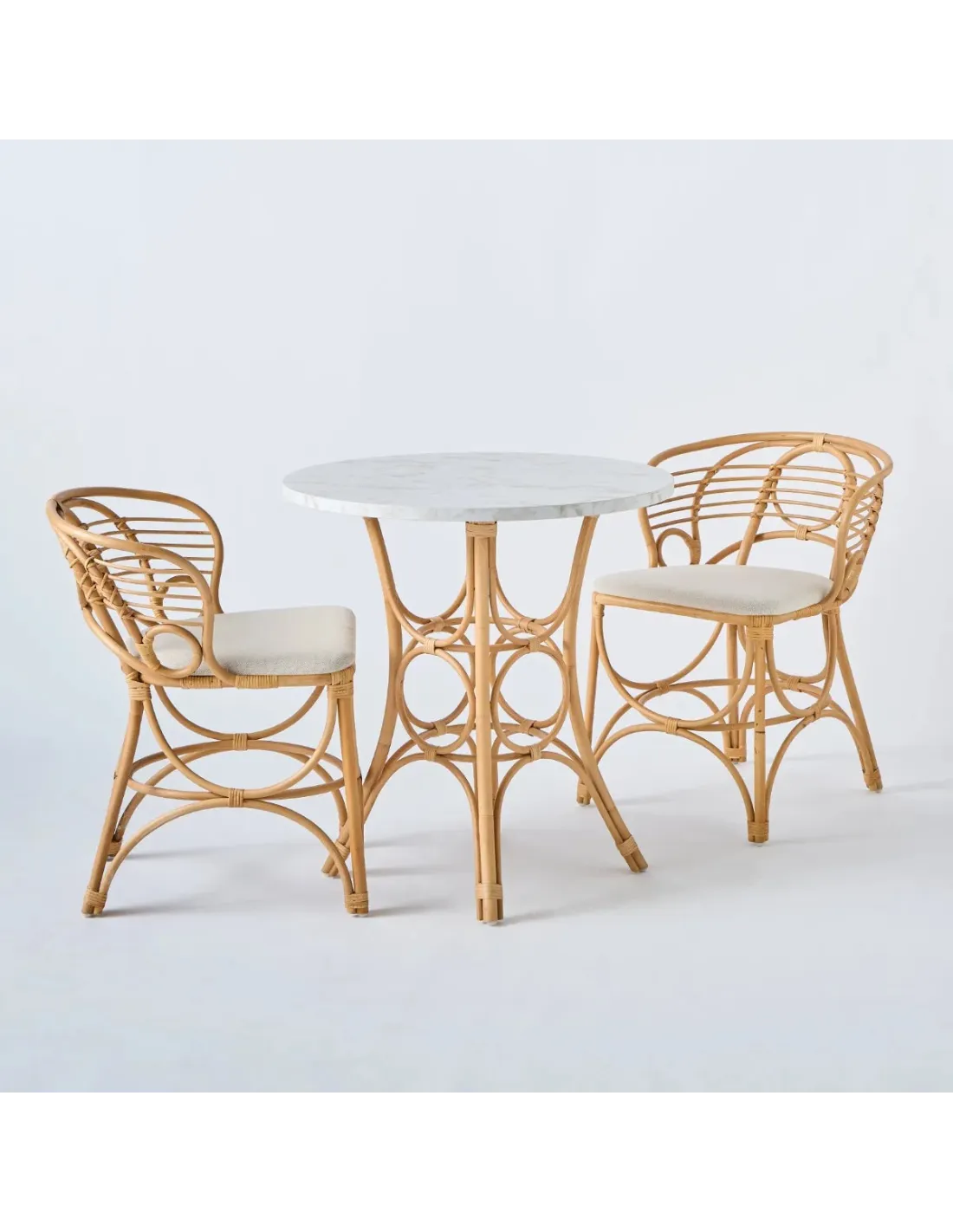 The Gingko dining rattan table, shown here with a 70 cm diameter laminate top (seating 2 to 3), takes up the traditional graphic codes of rattan cane furniture: the self-reinforcing arches throughout, the abundant binding and the slightly wild veining of the rattan fibre. Exotic, natural and full of curves, the Gingko rattan table will look at home in a conservatory, a winter garden, a house by the sea, in the countryside, in any living space where you need a little piece of nature.