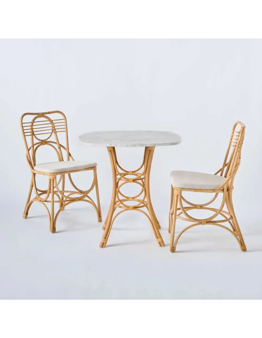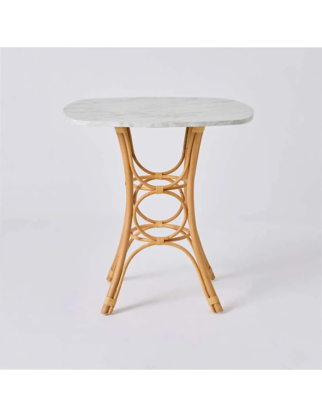 The Gingko rattan dining table, shown here with a white marble-effect laminate top measuring 70 x 70 cm (seating 2 to 3 people), embodies the traditional design features of rattan cane furniture: self-supporting arches all round, abundant bindings, and the slightly wild grain of the rattan fibre. Exotic, natural and full of curves, the Gingko rattan table fits perfectly in a conservatory, a winter garden, a seaside home, a country house, or any living space where you might feel the need for a little touch of nature.