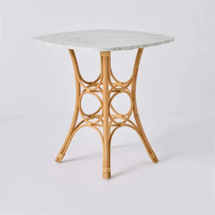 Frame made from semi-peeled rattan cane, bound with rattan strips, finished with a natural water-based varnish. Each leg is fitted with a nylon glide. White marble-effect laminated top, 2.6 cm thick, 70 cm wide and 70 cm deep. Weight 8 kg including the top. Legs supplied assembled, top to be placed on top. Made in Indonesia.