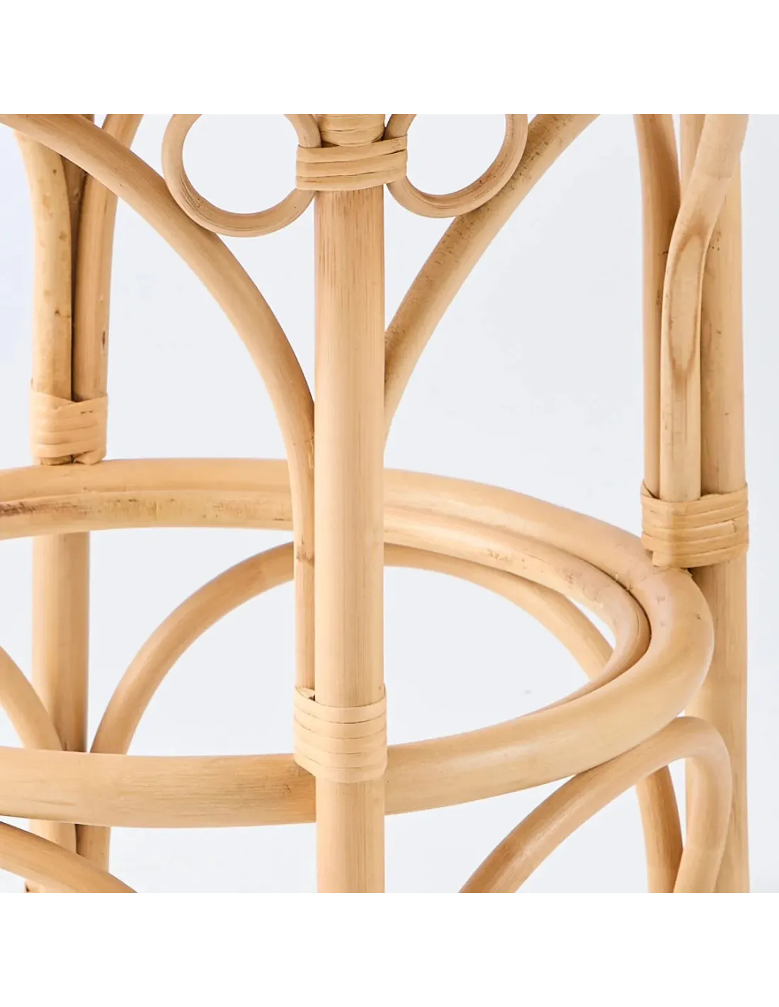 The Gingko rattan occasional table, shown here with a marble-effect laminate top, has a diameter of 70 cm and echoes the graphic codes of rattan cane furniture: curves, abundant arches and typical rattan splint ligatures. The blond colour of natural rattan and small ‘bubble’ patterns add a touch of poetry. The Gingko rattan pedestal table can be used as a side table, serving table, plant stand, or pedestal for a trinket or light fixture. Note the practicality of the laminated top, which is as sturdy as a kitchen worktop and therefore easy to maintain.