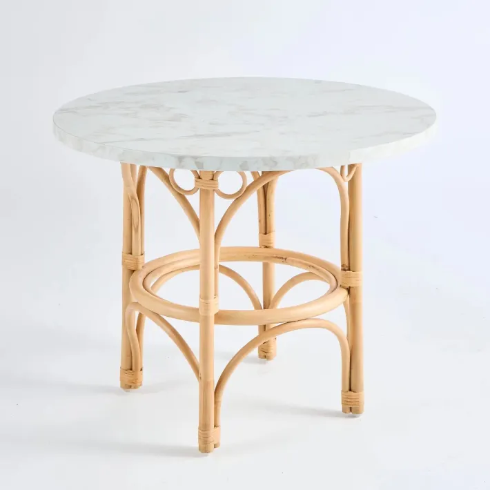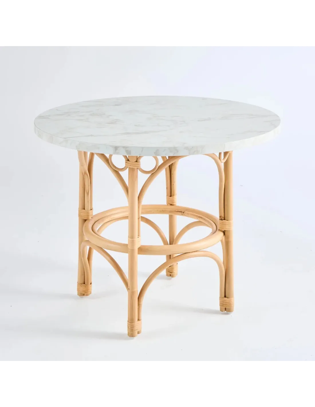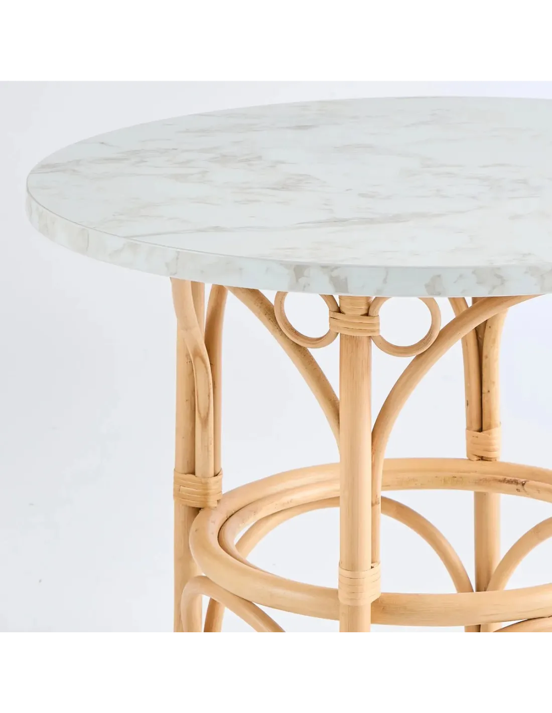 Half-barked rattan cane structure, rattan splint bindings, natural water-based varnish finish. Each leg is fitted with a nylon glide. 18 mm thick, 70 cm diameter HPL (High Pressure Laminated) marble effect laminate top.