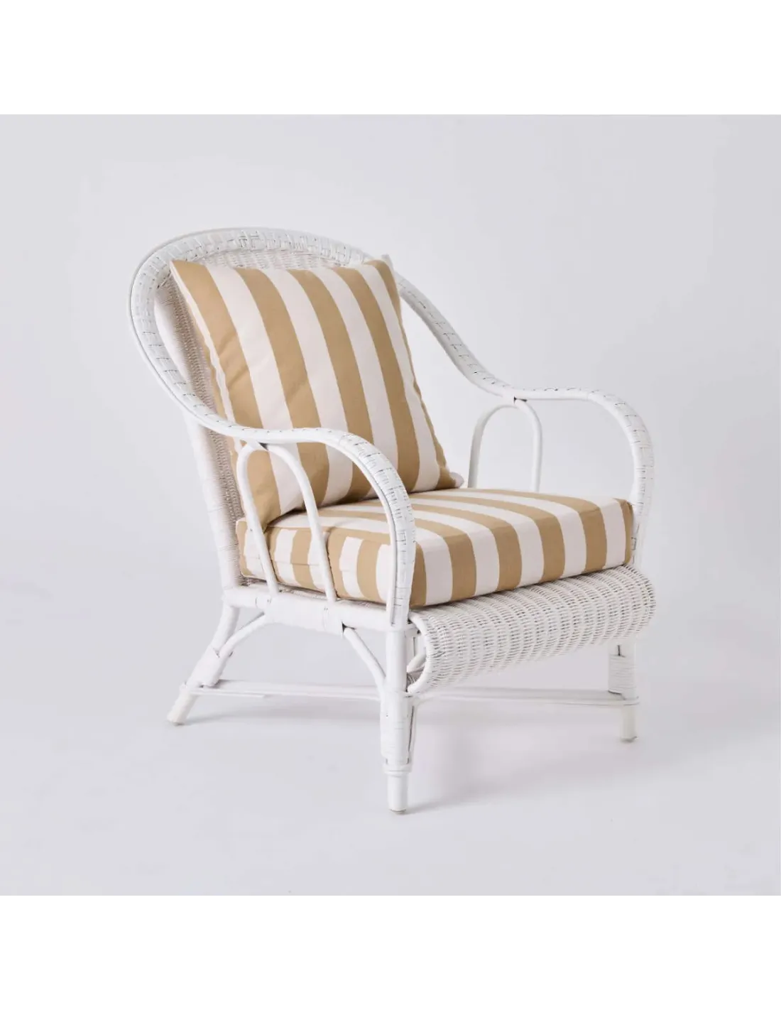 Natural rattan frame with a white lacquer finish. Seat cushion filled with 30 kg/m³ density polyurethane foam, back cushion filled with polyether wadding. Removable cushion covers.
