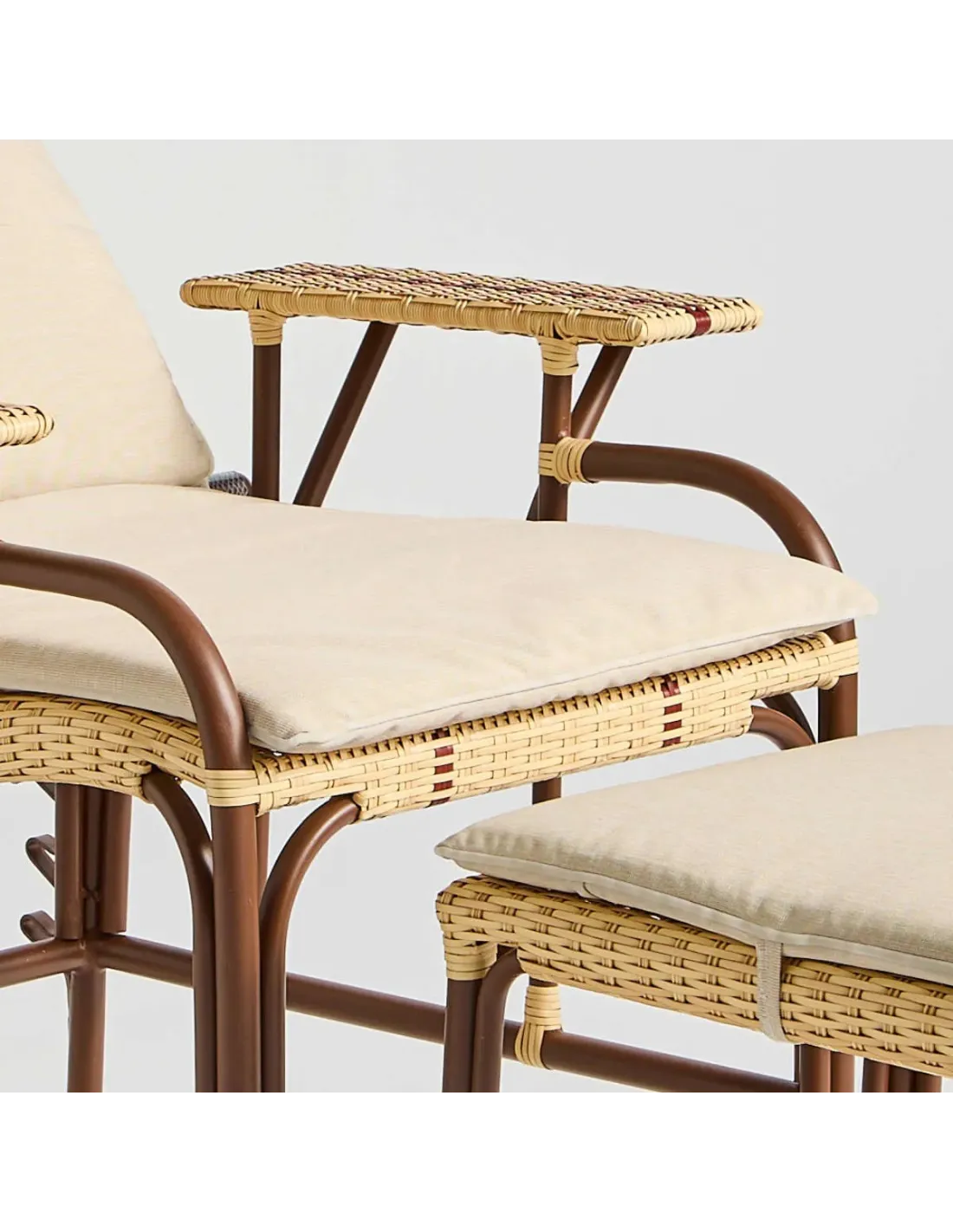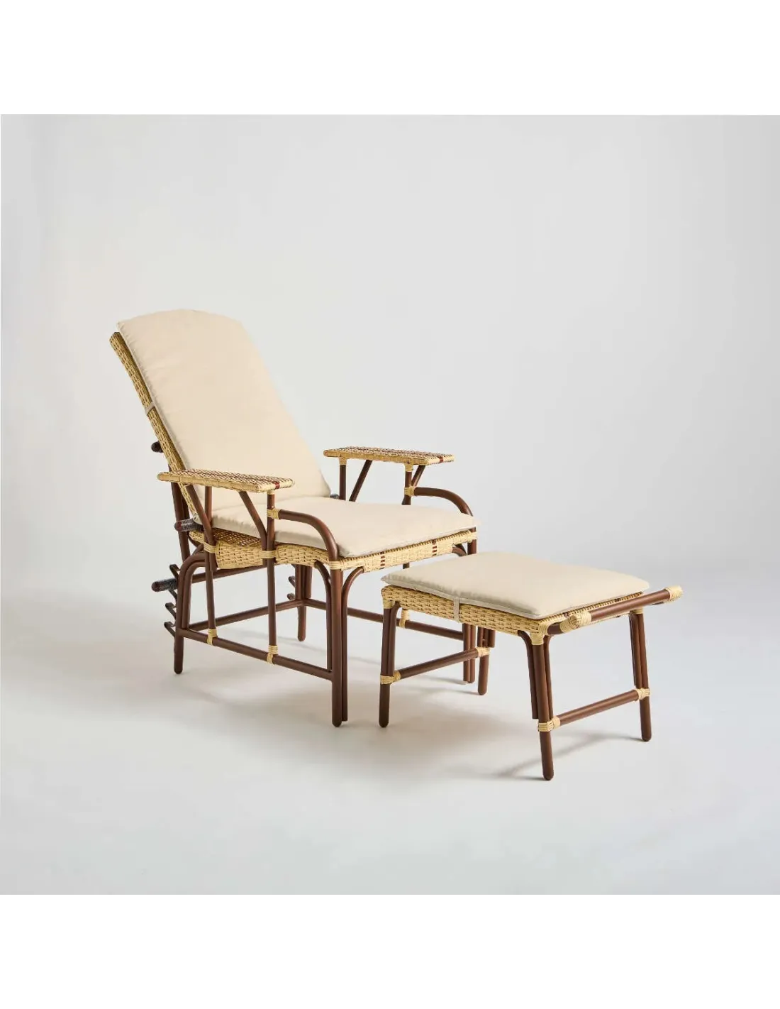 This complete cushion fits on the "Belle Epoque" rattan lounger from KOK Maison. It is composed of a seat and backrest connected by a piece of fabric that follows the inclination of the lounger, and a cushion for the footrest. The lounger is already quite comfortable so the cushion is only optional. However, it will add softness and comfort, much appreciated for a long afternoon nap.