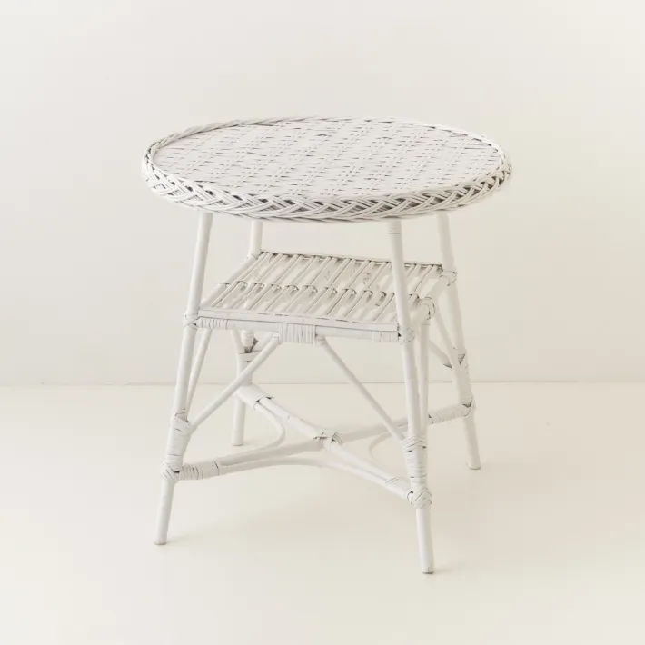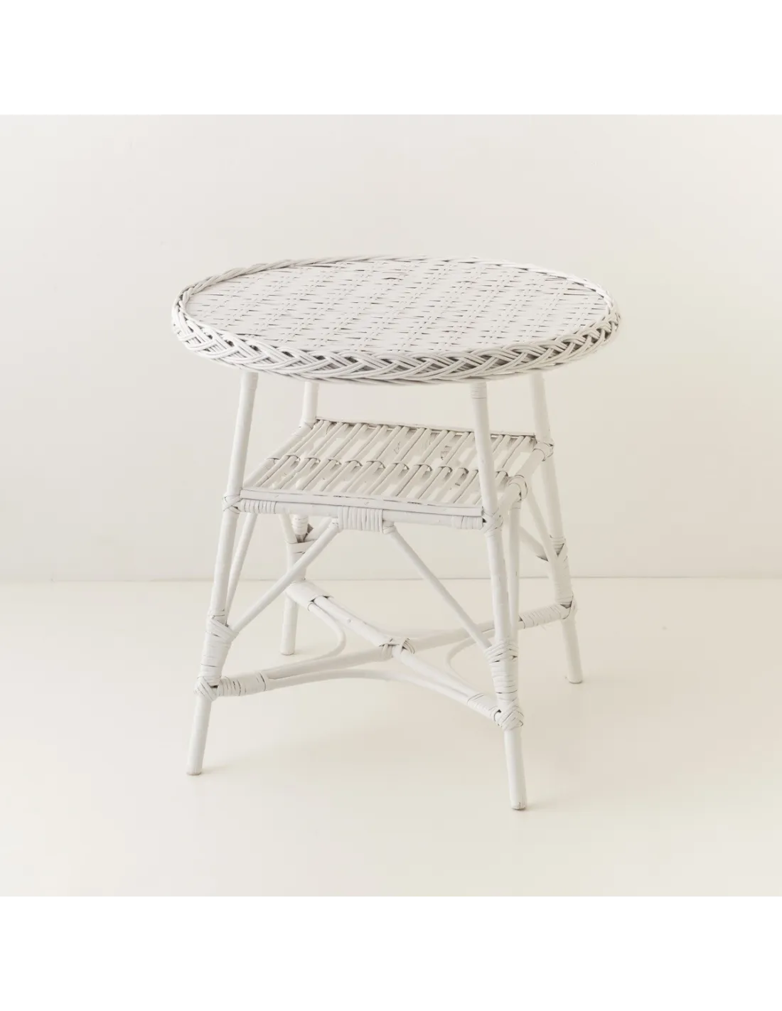 The Mélina table is in fact more of a pedestal table, lower by 10 cm than a real dining table. It matches the Antonin, Mathurin, and Firmin wicker chairs, which are made from similar wicker weaving. The top of the table is woven from wicker splints in the same colour as the rest of the furniture, placed on a wooden support, which ensures the surface's stability and rigidity. The Mélina table will be just the right height for an aperitif, tea or coffee, or to place a lamp or ornament on.