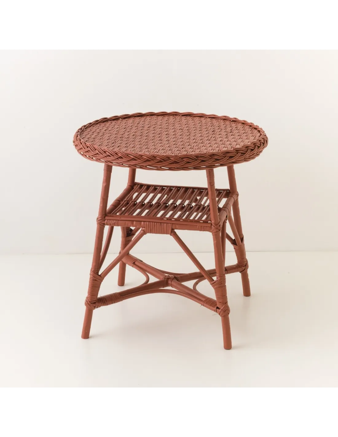 The Mélina table is in fact more of a pedestal table, lower by 10 cm than a real dining table. It matches the Antonin, Mathurin, and Firmin wicker chairs, which are made from similar wicker weaving. The top of the table is woven from wicker splints in the same colour as the rest of the furniture, placed on a wooden support, which ensures the surface's stability and rigidity. The Mélina table will be just the right height for an aperitif, tea or coffee, or to place a lamp or ornament on.