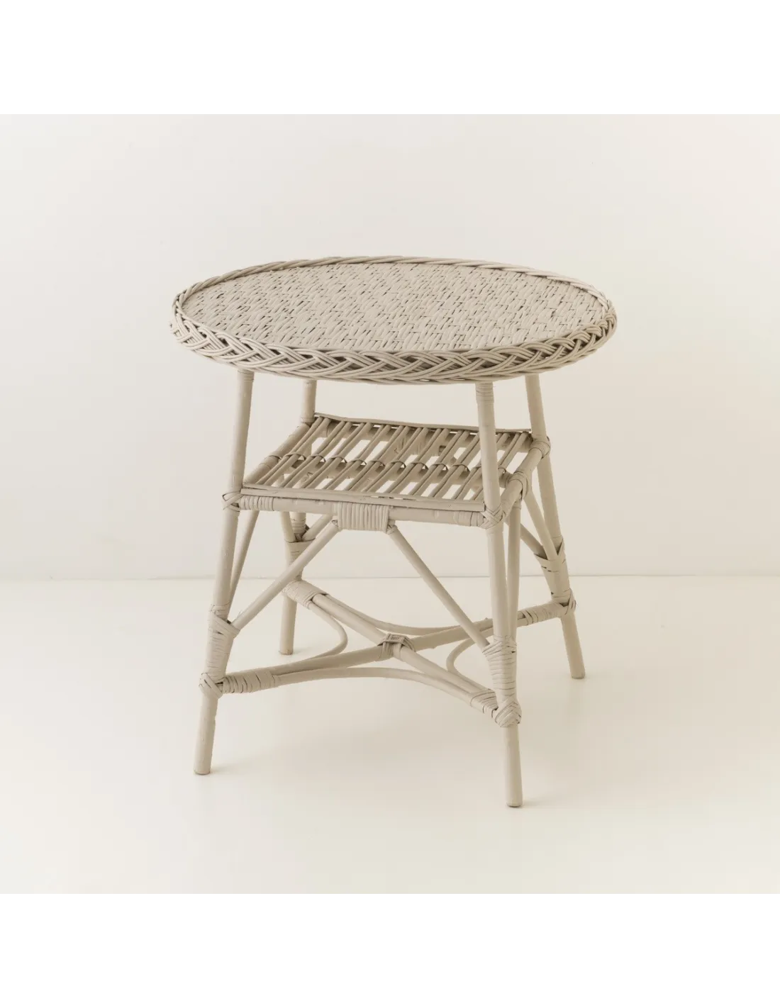 The Mélina table is in fact more of a pedestal table, lower by 10 cm than a real dining table. It matches the Antonin, Mathurin, and Firmin wicker chairs, which are made from similar wicker weaving. The top of the table is woven from wicker splints in the same colour as the rest of the furniture, placed on a wooden support, which ensures the surface's stability and rigidity. The Mélina table will be just the right height for an aperitif, tea or coffee, or to place a lamp or ornament on. It is available here in several matte lacquer colors, with a finish made to order (delivery time approximately 15 days to 3 weeks) in France.
